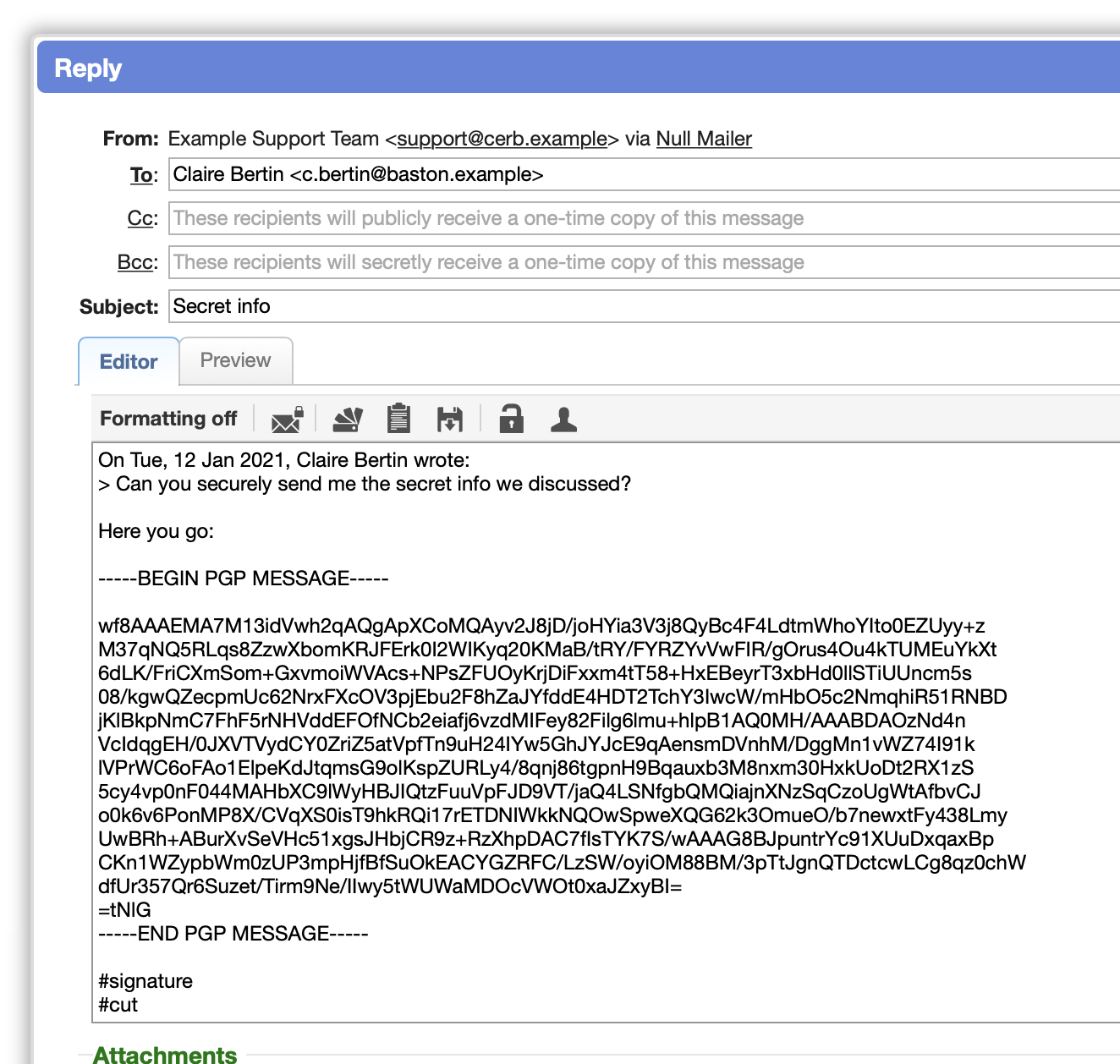 A few users have asked for a way to encrypt and paste ASCII-armored PGP messages from the compose and reply editors, entirely within Cerb. This can be done with browser plugins like Mailvelope, but doing it in Cerb allows all workers to share the same repository of public keys without having to install any extra software.