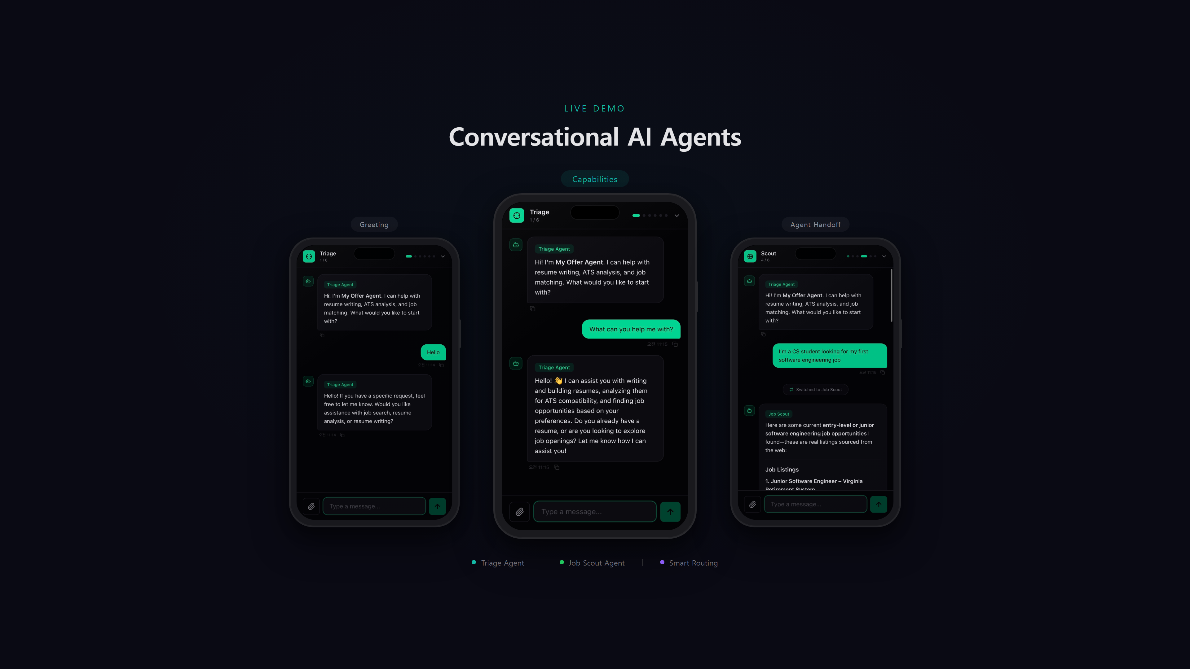 The Triage agent greets users, explains available features, and automatically hands off to the right specialist — like Job Scout — when it detects intent.