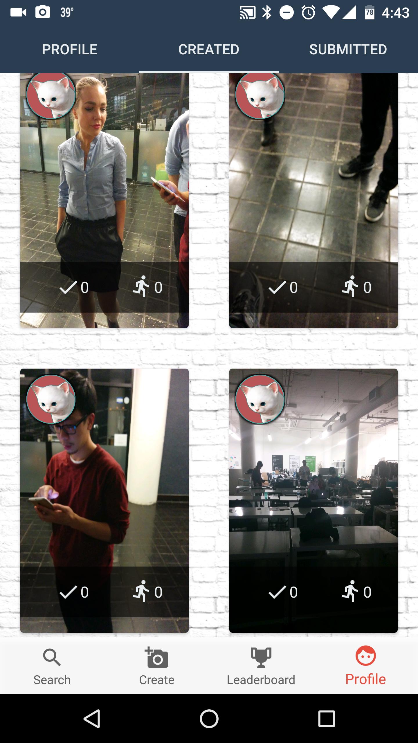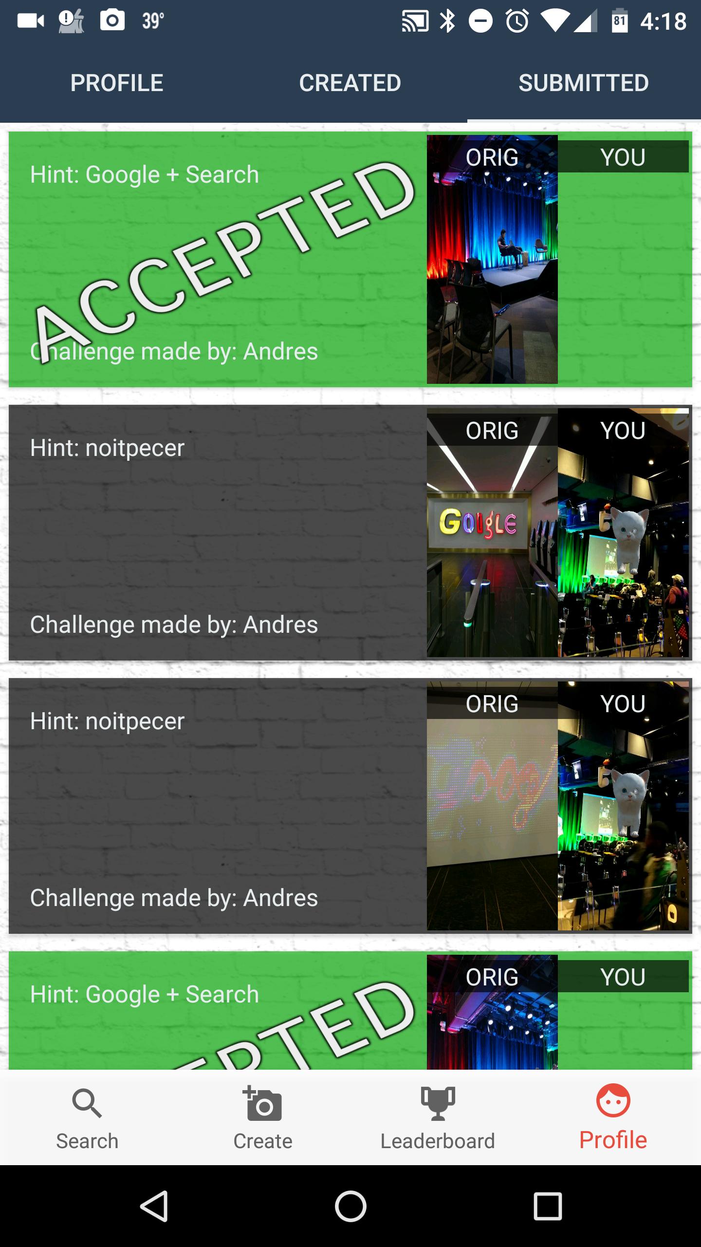 Process of review! Players are encouraged to accept or decline a submitted challenge they've created and that other players have participated in. You can swipe left (decline) or right (accept) to a submission that someone has made on your challenge. We put the players in charge of this system to facilitate a more community stimulated game.