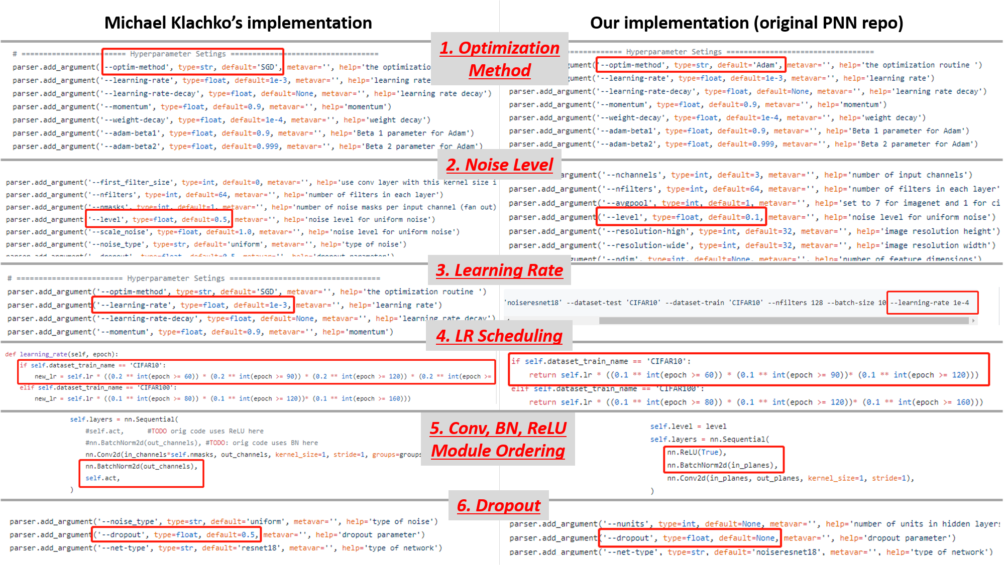 Among these inconsistencies, based on our limited number of trials, the first two (optimization method and noise level) have the most negative impact on the PNN performance. The choice of optimization method is indeed very important and on smaller scale experiments, each optimization method (SGD, Adam, RMSProp, etc.) will traverse the optimization landscape quite differently. The choice of additive noise level is also very important, and we will come back to that in Section 3.