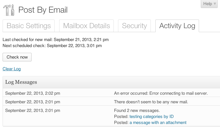 - Navigate to the "Activity Log" tab and press the "Check Now" button. When the page reloads, you should see a new entry in the log file describing the results of the mail check.