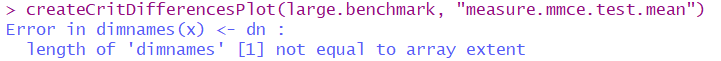 @alona-sydorova the mlr::generateCritDifferencesData can not work with length(task.id) <2. the large.benchmark has many replication in a specificed problem. The input of mlr::generateCritDifferencesData do not consider about the replication. So, how to deal with these replication? |