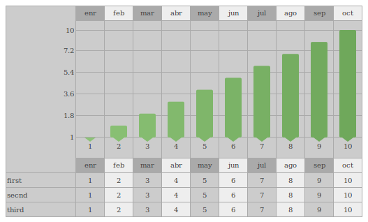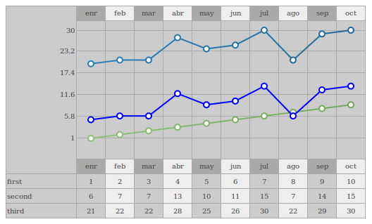 In case you want to print a line graph, most of the keys un the past examples apply here. Now you need to pass via graph key more than 1 array of items in order to paint diferente lines. The table key just need to be set and will be feed with the same graph values. For the different colours of the lines you need to fill graph.colors, one value per line with a fixed string meaning solid colour or a pair of two being a gradient.