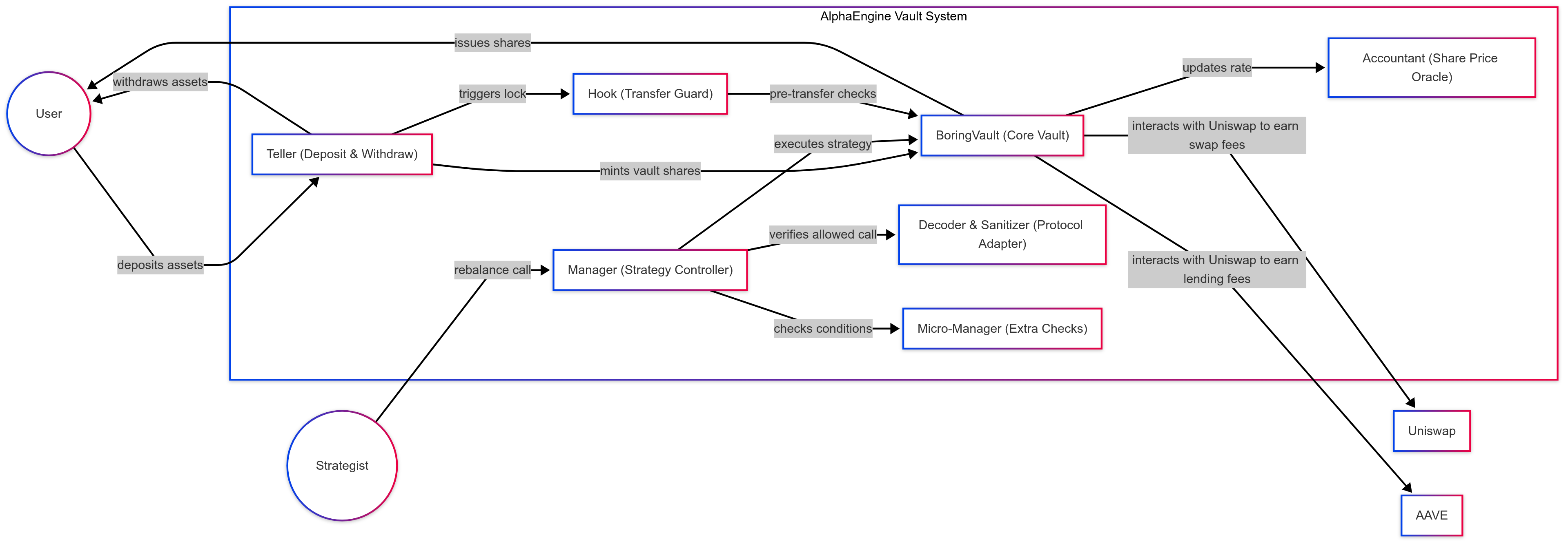 AlphaEngine inherits and adapts the sophisticated, modular smart contract architecture developed by VEDA. This design prioritizes security, flexibility, and efficiency in managing on-chain yield strategies.
