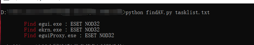 findAV 辅助判断系统存在的杀毒软件 usage: findAV.py <tasklist.txt> avlist来自github.com/uknowsec/get_AV/blob/master/av.json