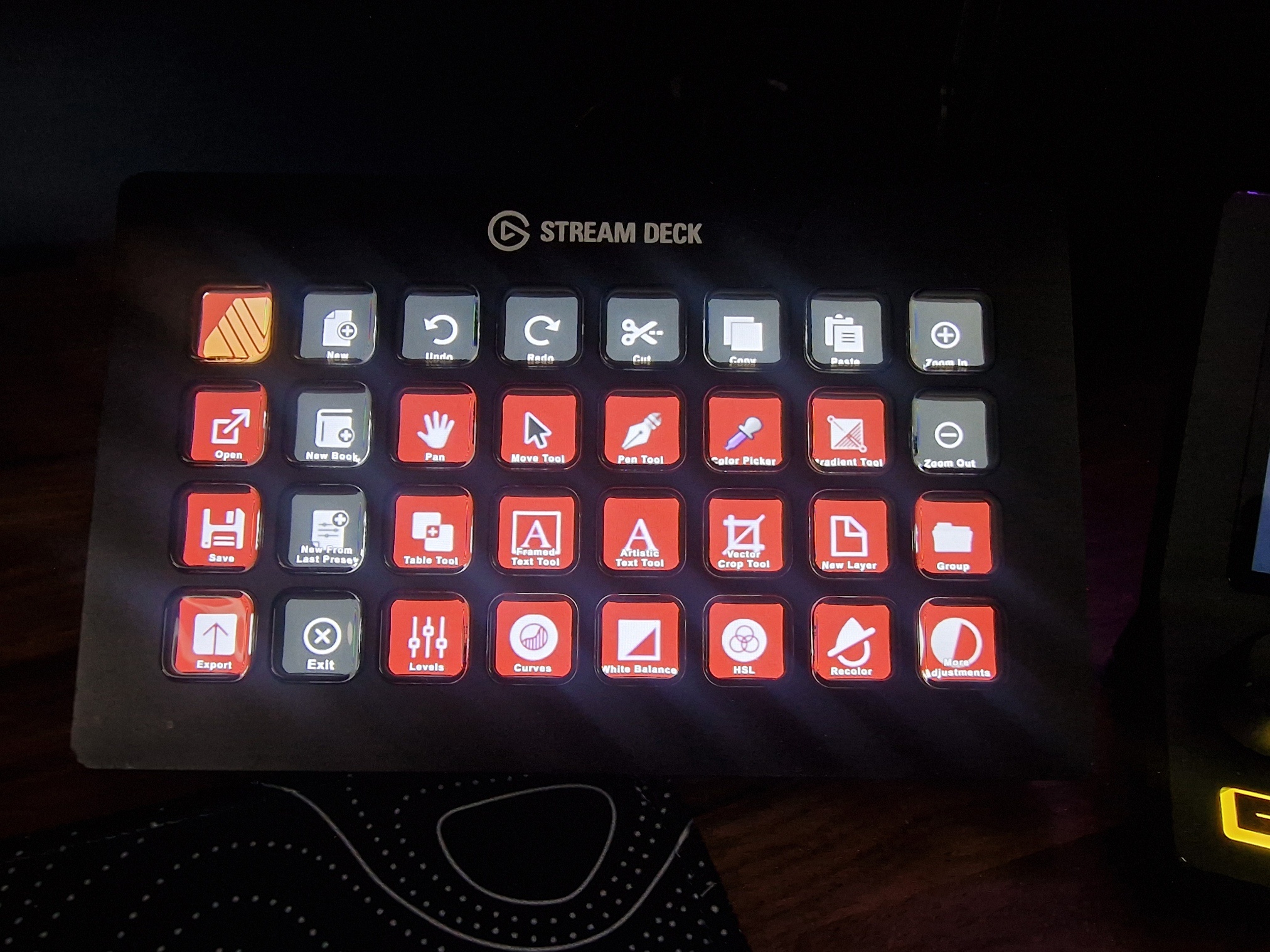 Please note: You must import the "streamdeck-hotkeys-photo.afshort" hotkey file in the mapping settings within Affinity Photo to enable full functionality of the profile. This contains updated mappings for various adjustment controls.