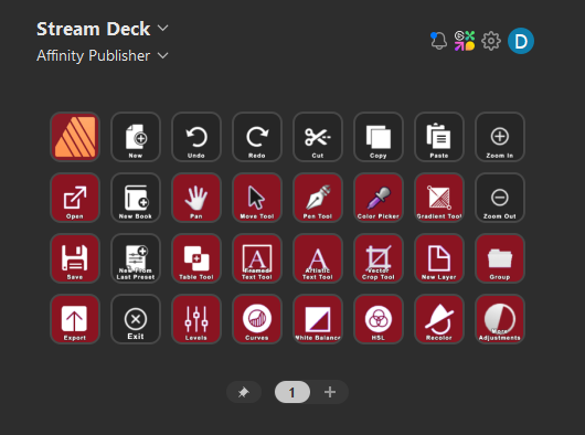 This is a streamdeck profile that I have created for Affinity Publisher which includes macros for common tools & adjustments.