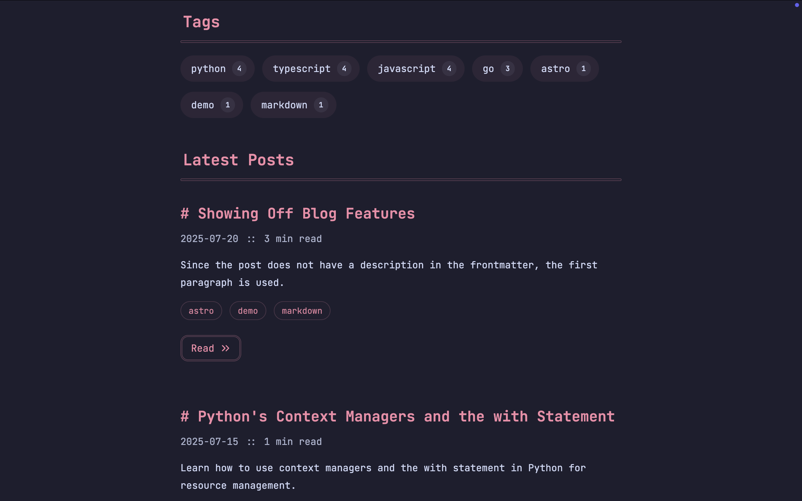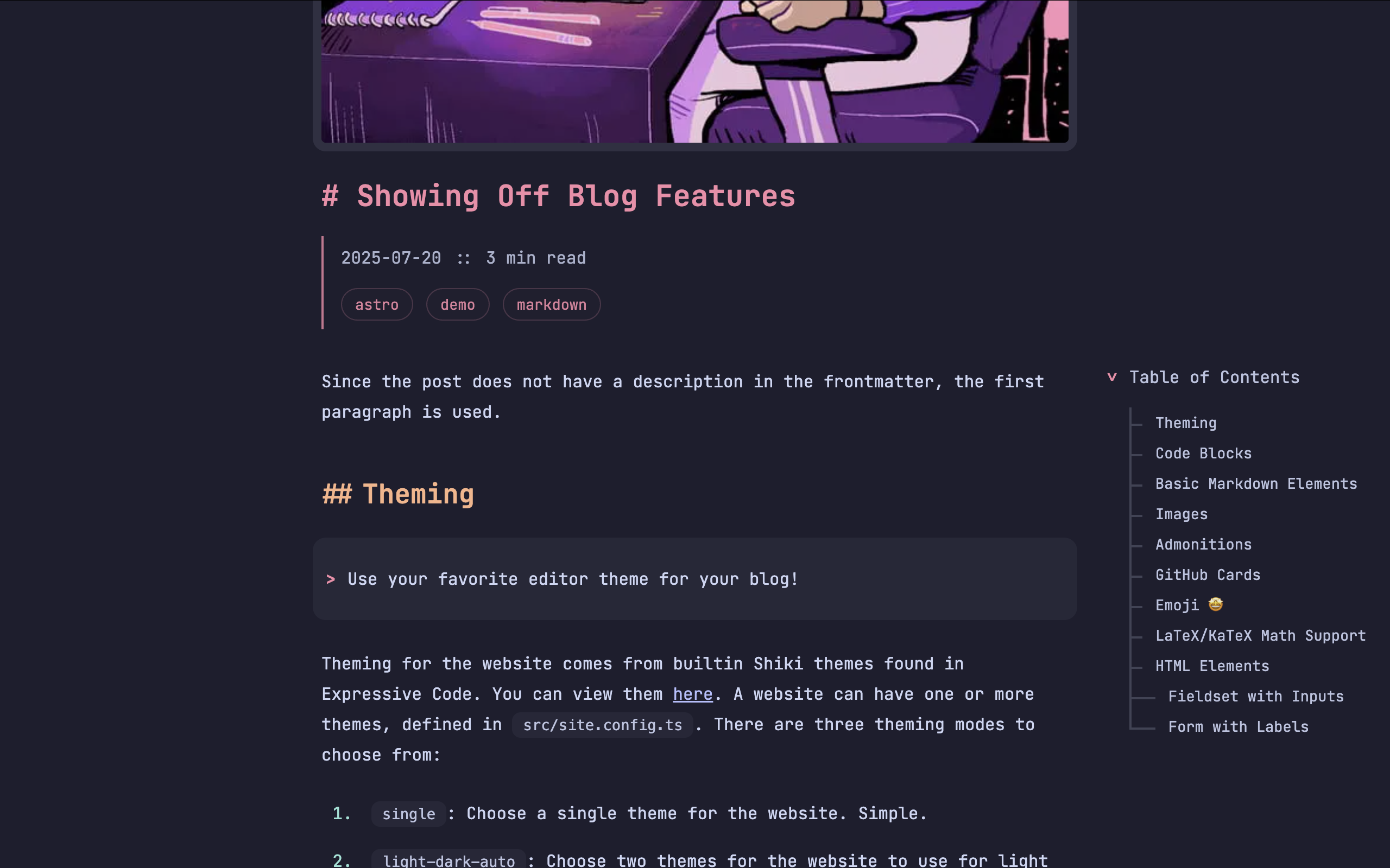 - Amazing Theme Selection: Personalize your blog's appearance with your favorite editor color scheme. Pick your favorite Shiki themes bundled with Expressive Code.
