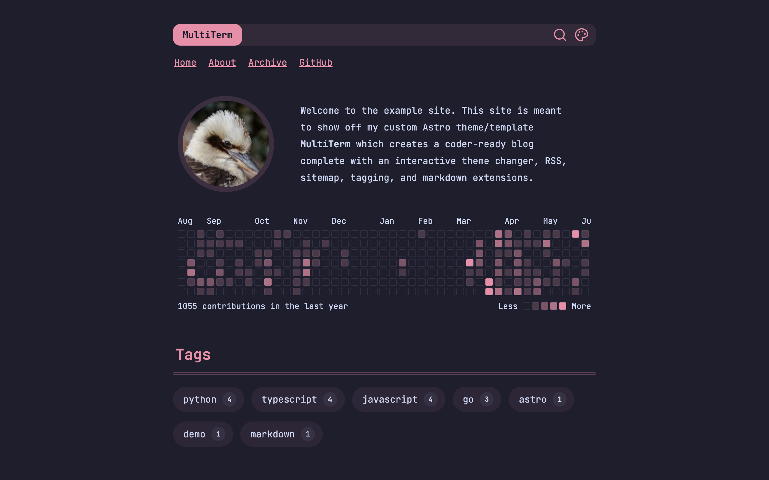 MultiTerm is an Astro blog theme designed for coders who love their color schemes. Easily theme your whole website with your favorite color schemes and have your prose rendered with a nod to the aesthetics of raw markdown.
