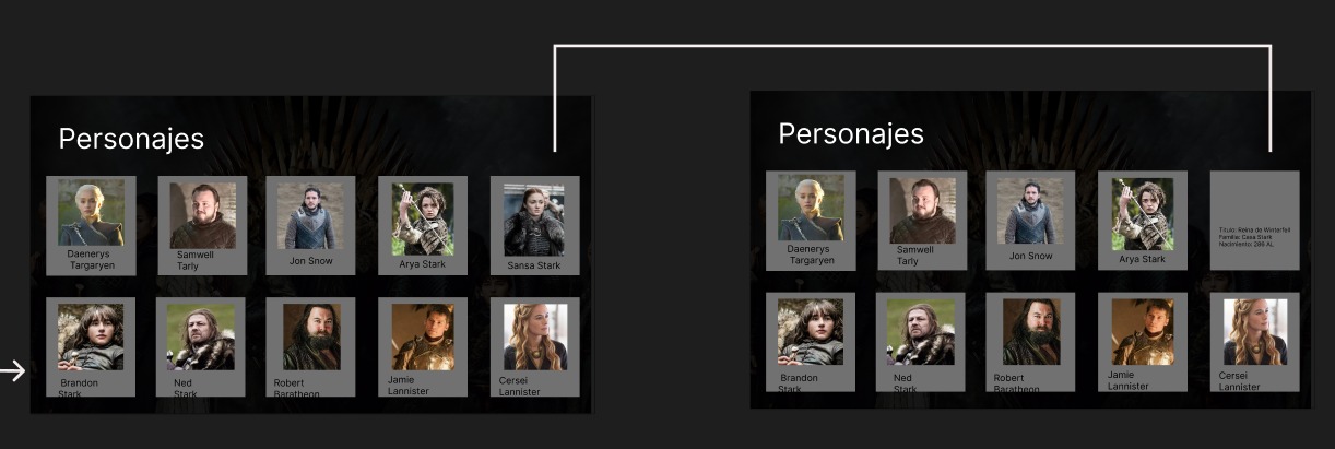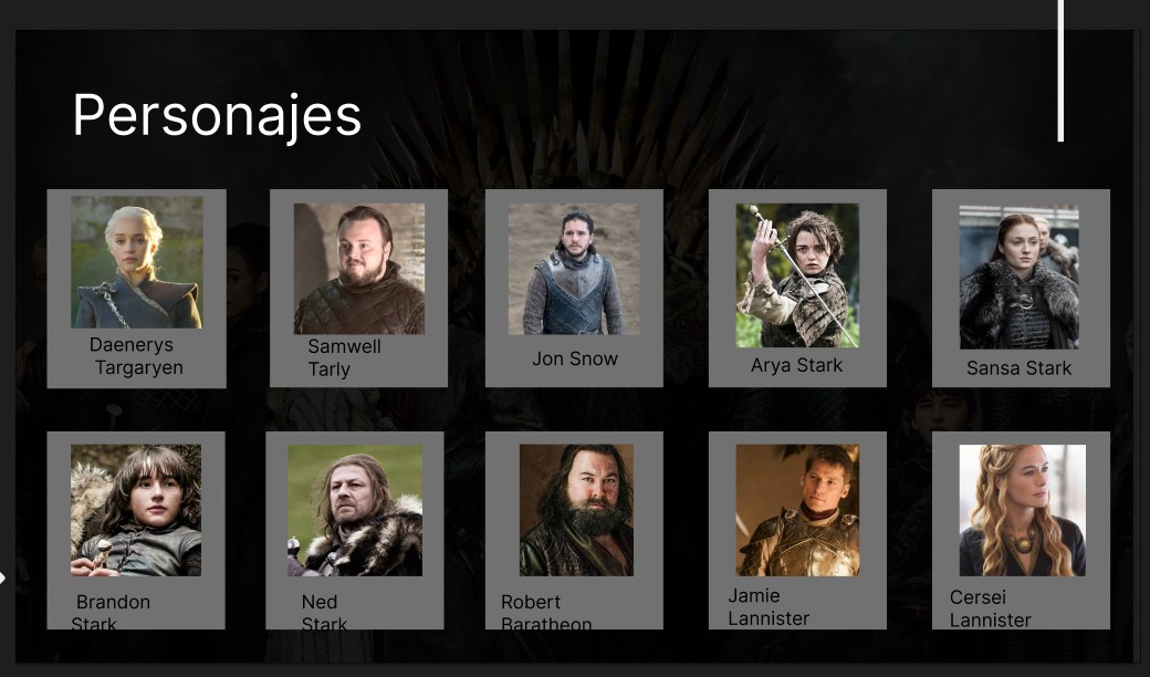 2.Despliegue de todos los personajes Se generó un menú en que se despliegue el poster de cada uno de los personajes de game of thrones. Para hace más fácil la elección de los personajes a investigar, se decidió crear dos botón de búsqueda, uno para filtar los personajes por cada uno de los apellidos y un botón para ordenar la data en orden alfabético.