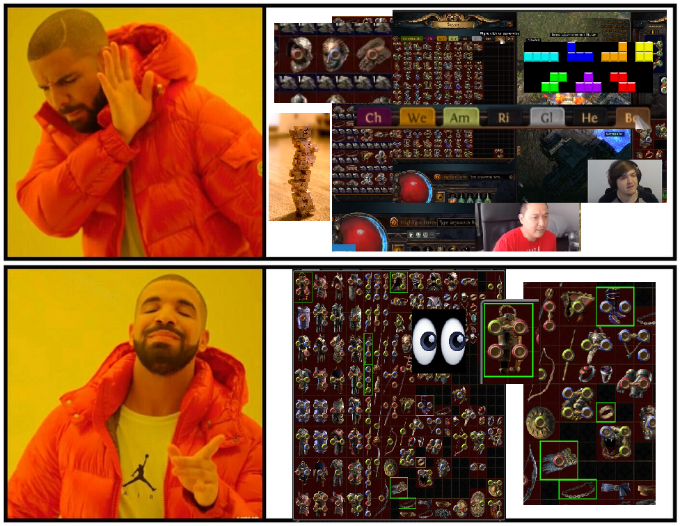 Maybe GGG will implement some form of a premium recipe fulfilling tab in the distant dystopian future, but until then, the only way to truly optimize vendor recipe discovery (WITHOUT buying 10 quad tabs) is to augment your brain with an AI implant, improving chaos recipe item recognition by a factor of 10. As an added bonus, the AI will be able to discern what killed you in Blight encounters when your screen looks like a bowl of spaghetti.