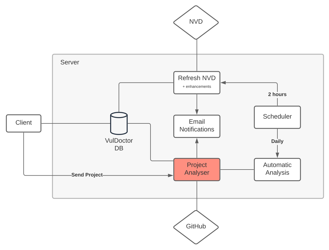 VDB_HOME=/***/***/***/vuldoctor/microservices/dep_check/dbVulDoctor is built using a React frontend and Express.js backend. Further stack details can be found here. The overall architecture is described below: