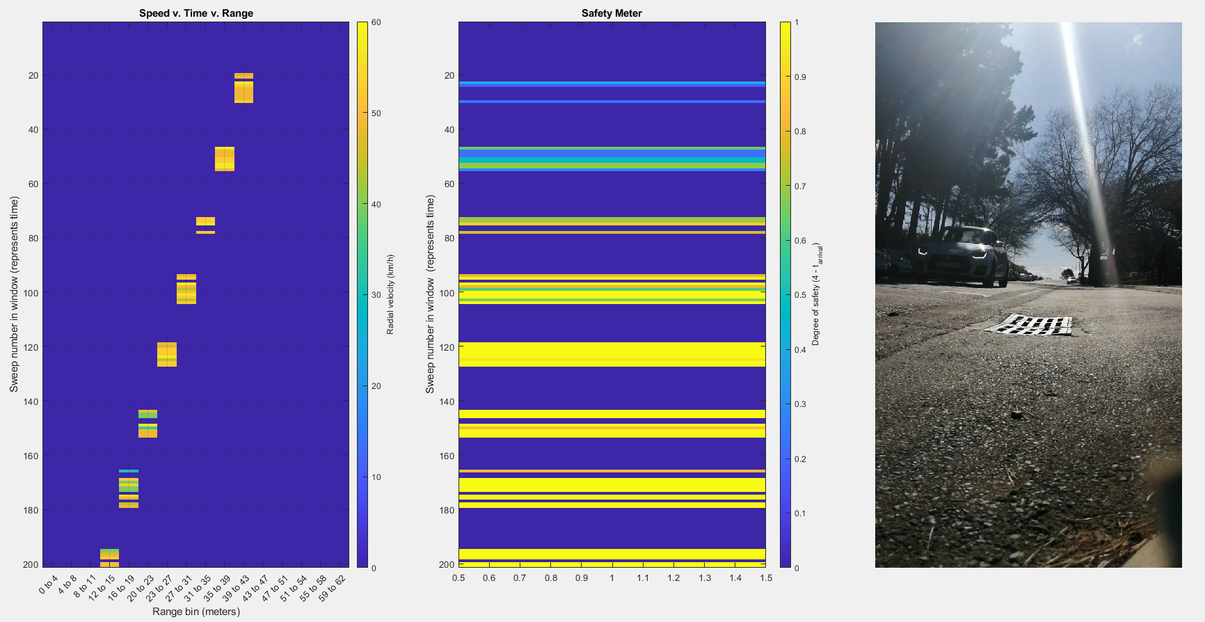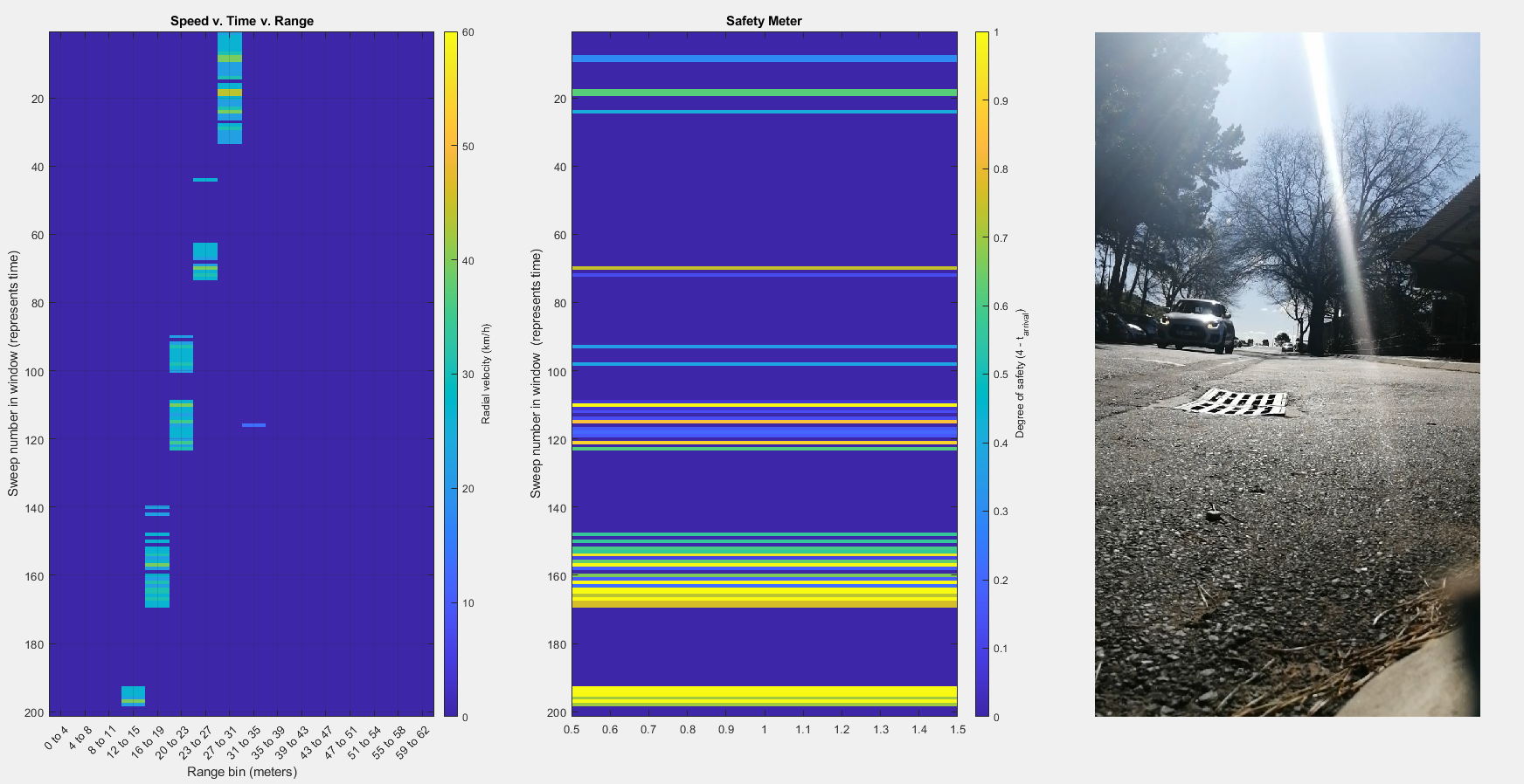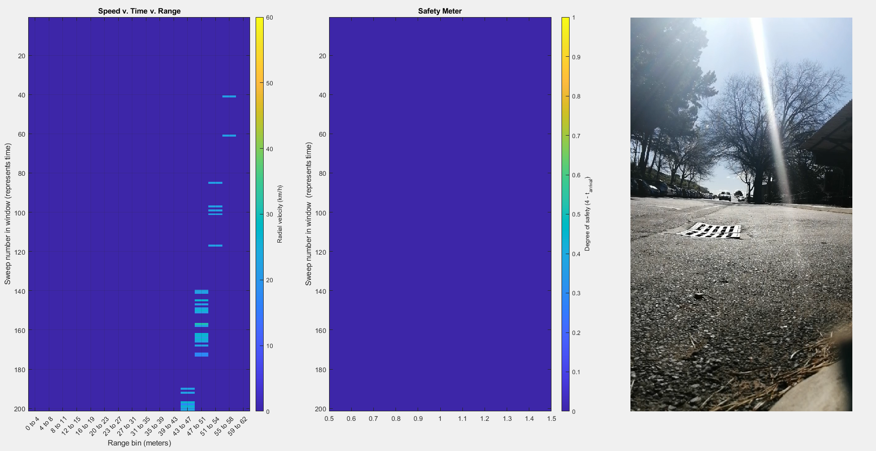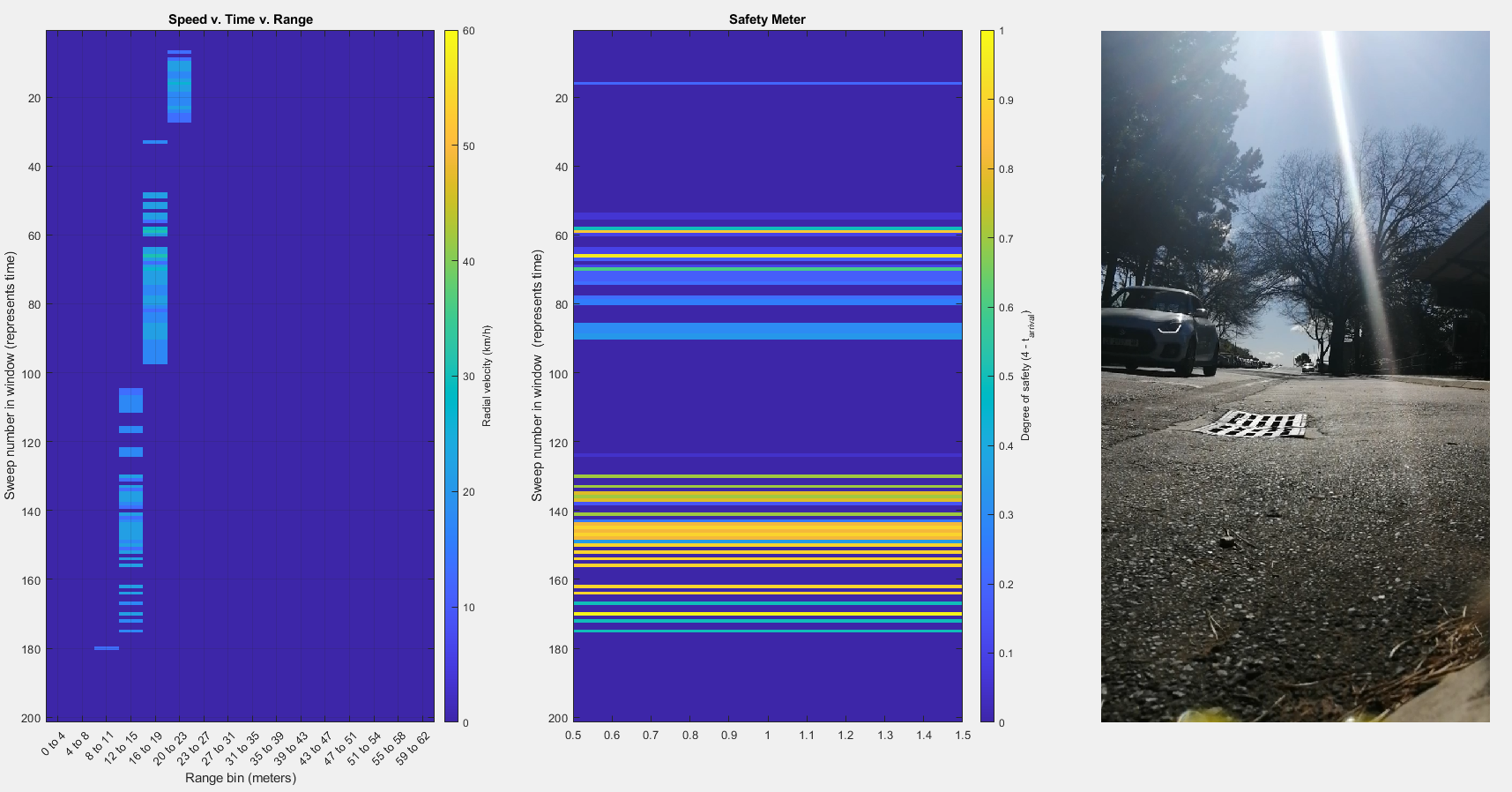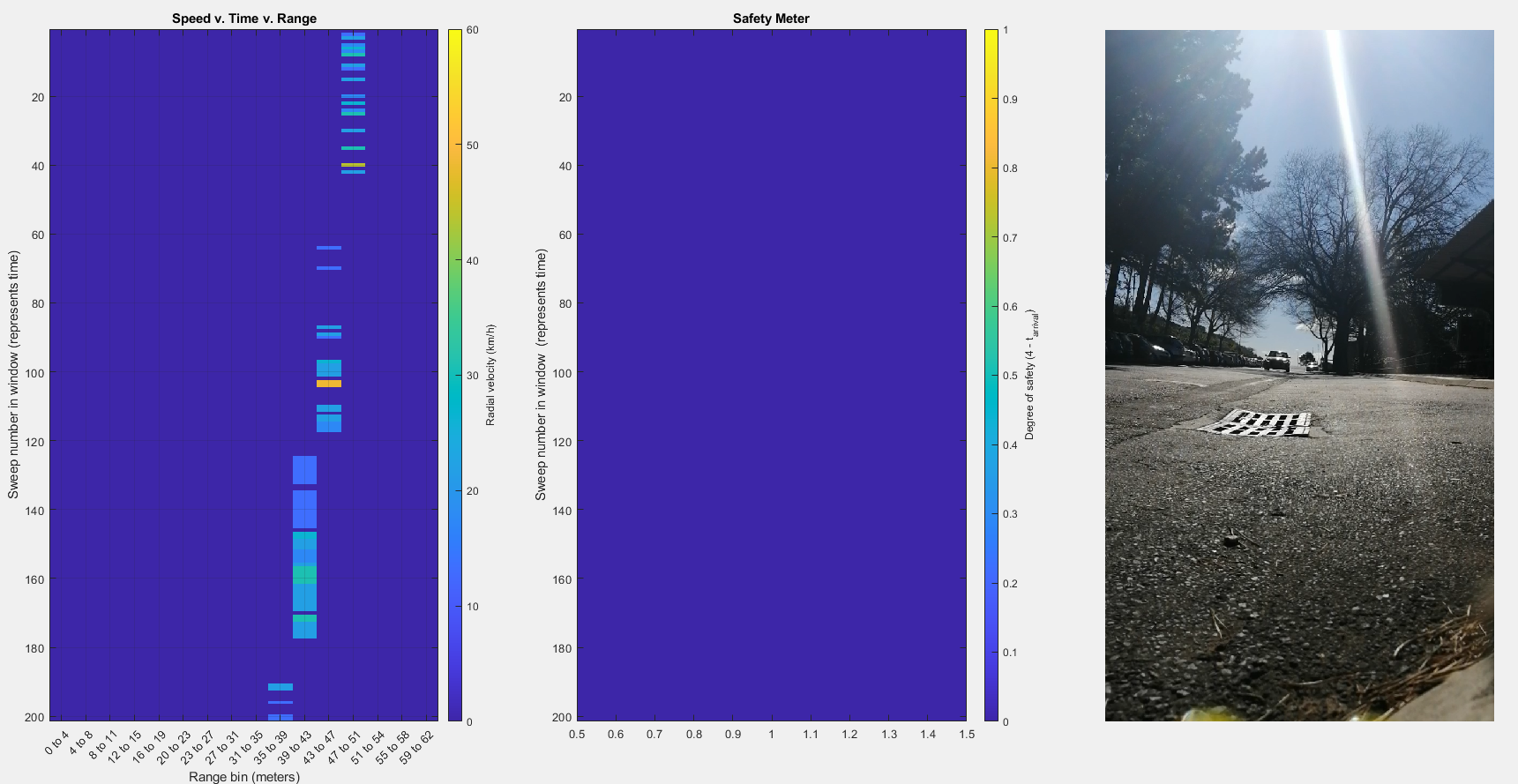 Taken on upper uct road, car traveling at a known speed/controlled experiment. Safety based on a min arrival time of 3 seconds, with a max speed of 60 km/h. Speeds tested: 20, 30, 40, 50, 60, 70 km/h. Video and radar output not perfectly synchronised (magic numbers used) due to unknown time required to render colour maps. Safety meter shows 4 sec - TOA. This allows shorter times (less safe) to be shown with a 'higher' colour.