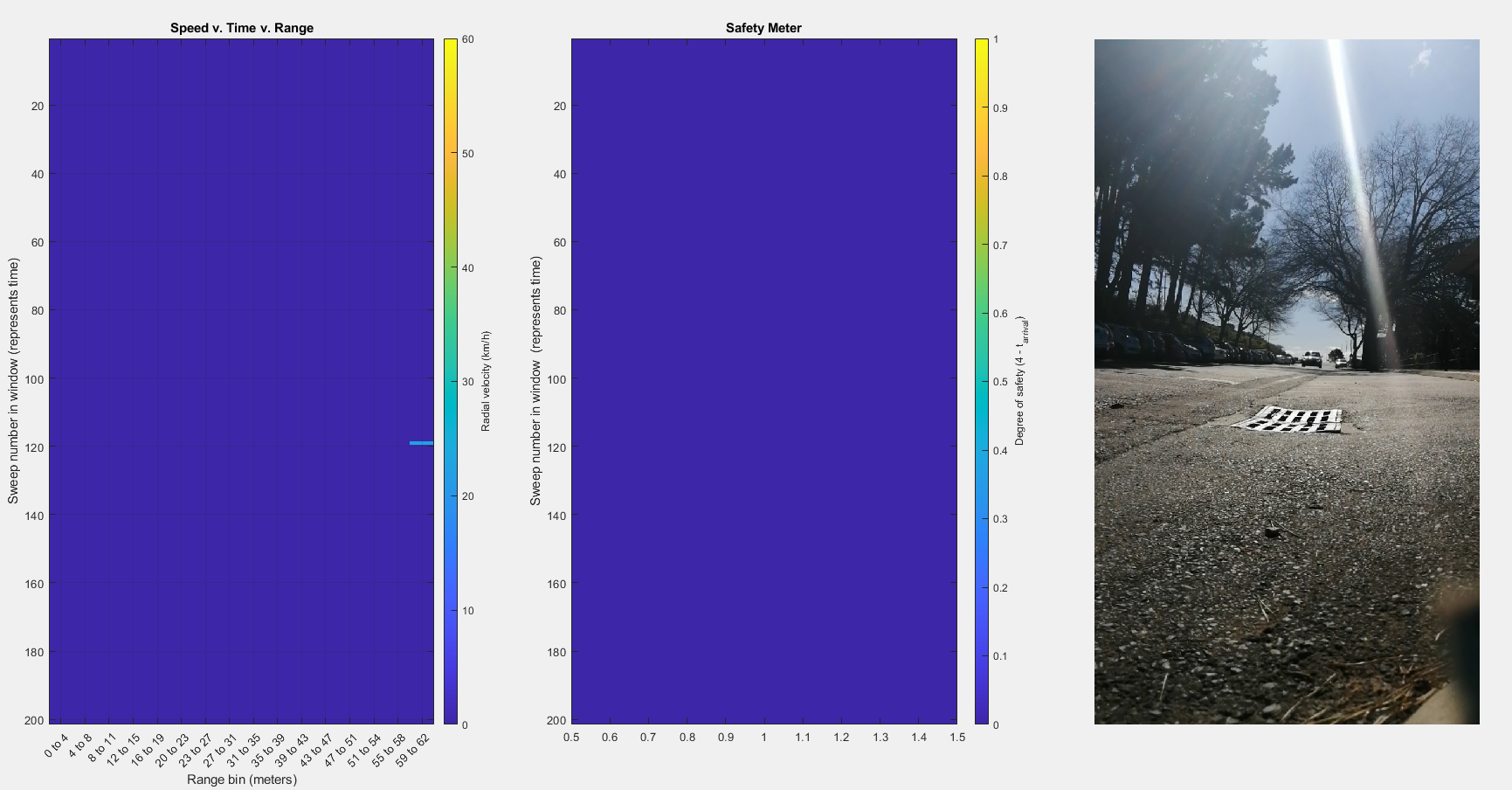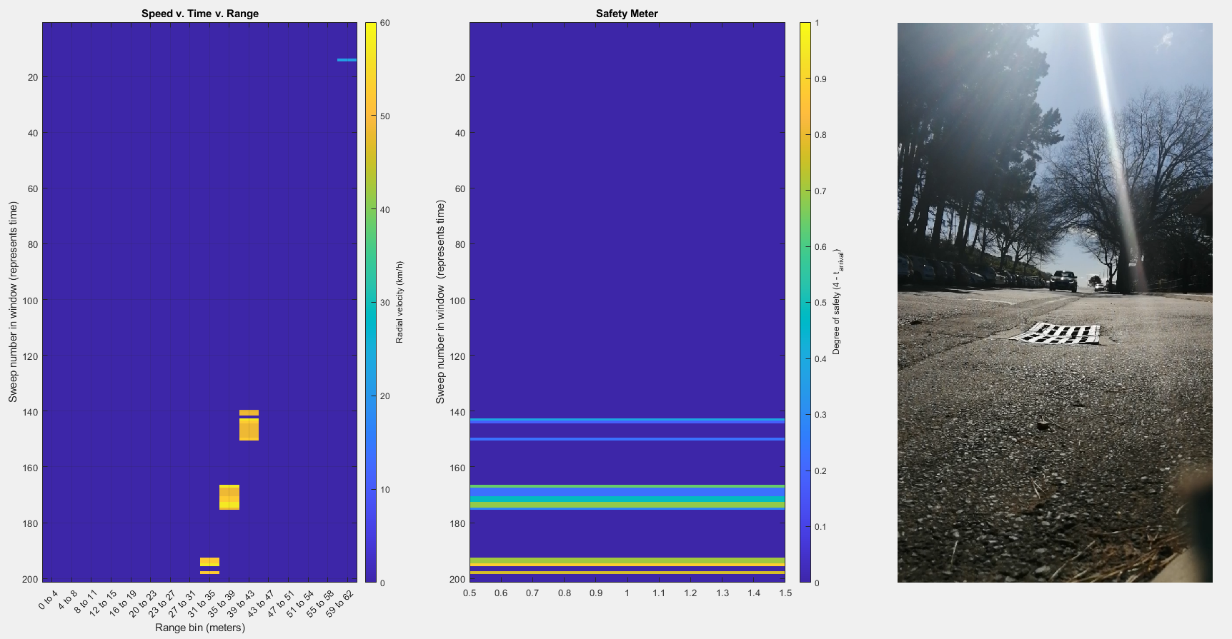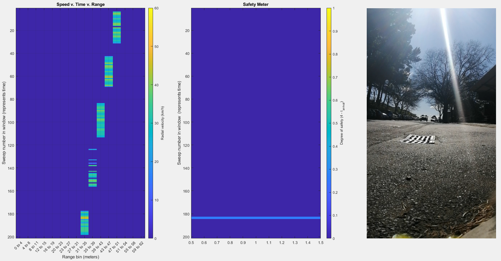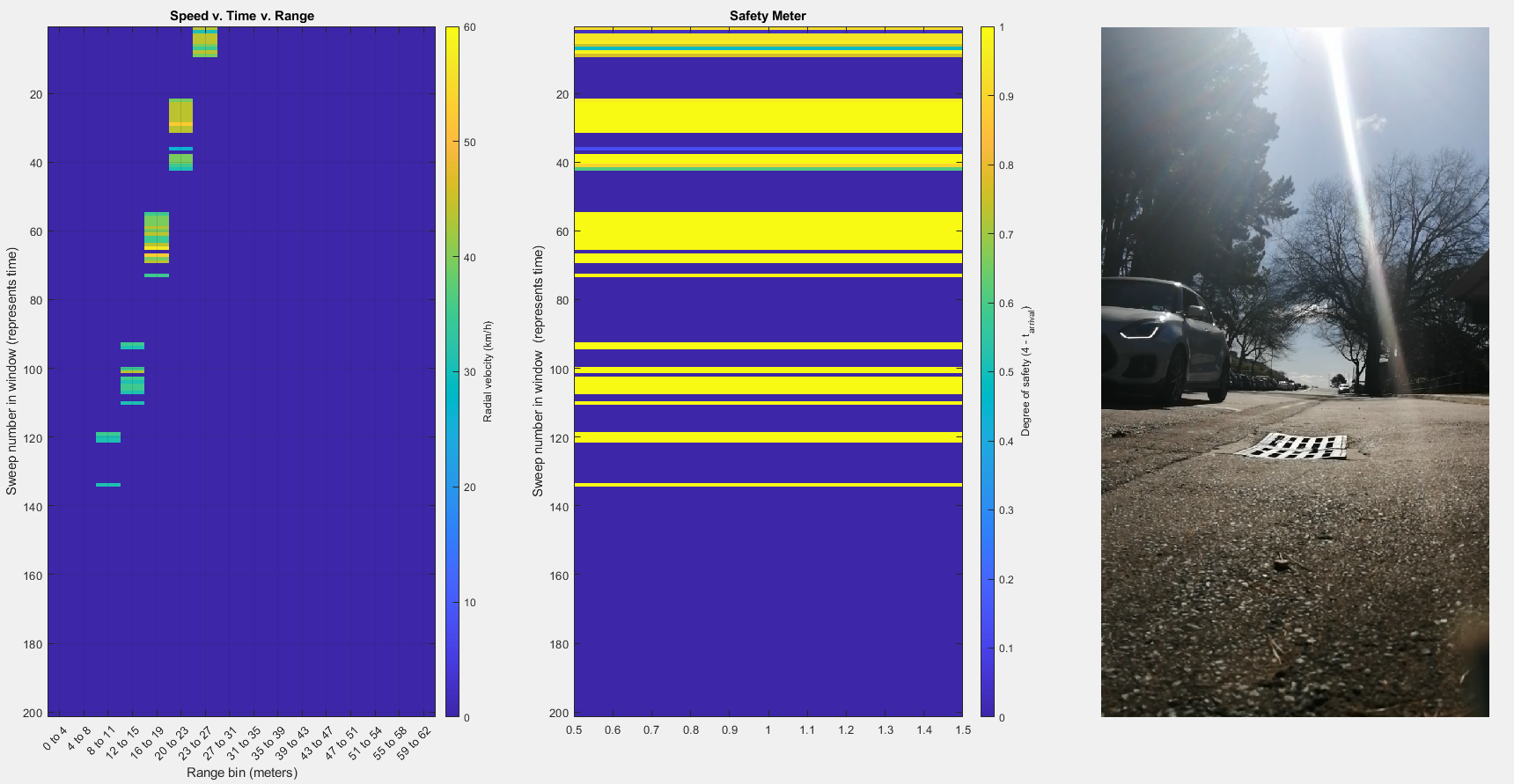 Taken on upper uct road, car traveling at a known speed/controlled experiment. Safety based on a min arrival time of 3 seconds, with a max speed of 60 km/h. Speeds tested: 20, 30, 40, 50, 60, 70 km/h. Video and radar output not perfectly synchronised (magic numbers used) due to unknown time required to render colour maps. Safety meter shows 4 sec - TOA. This allows shorter times (less safe) to be shown with a 'higher' colour.
