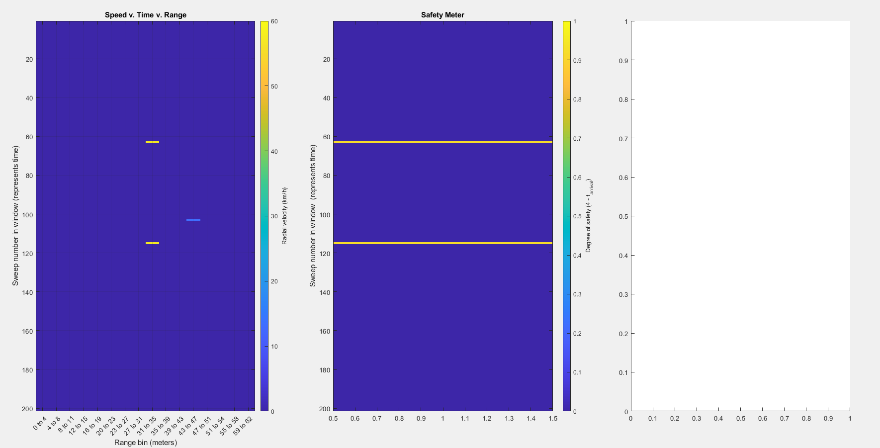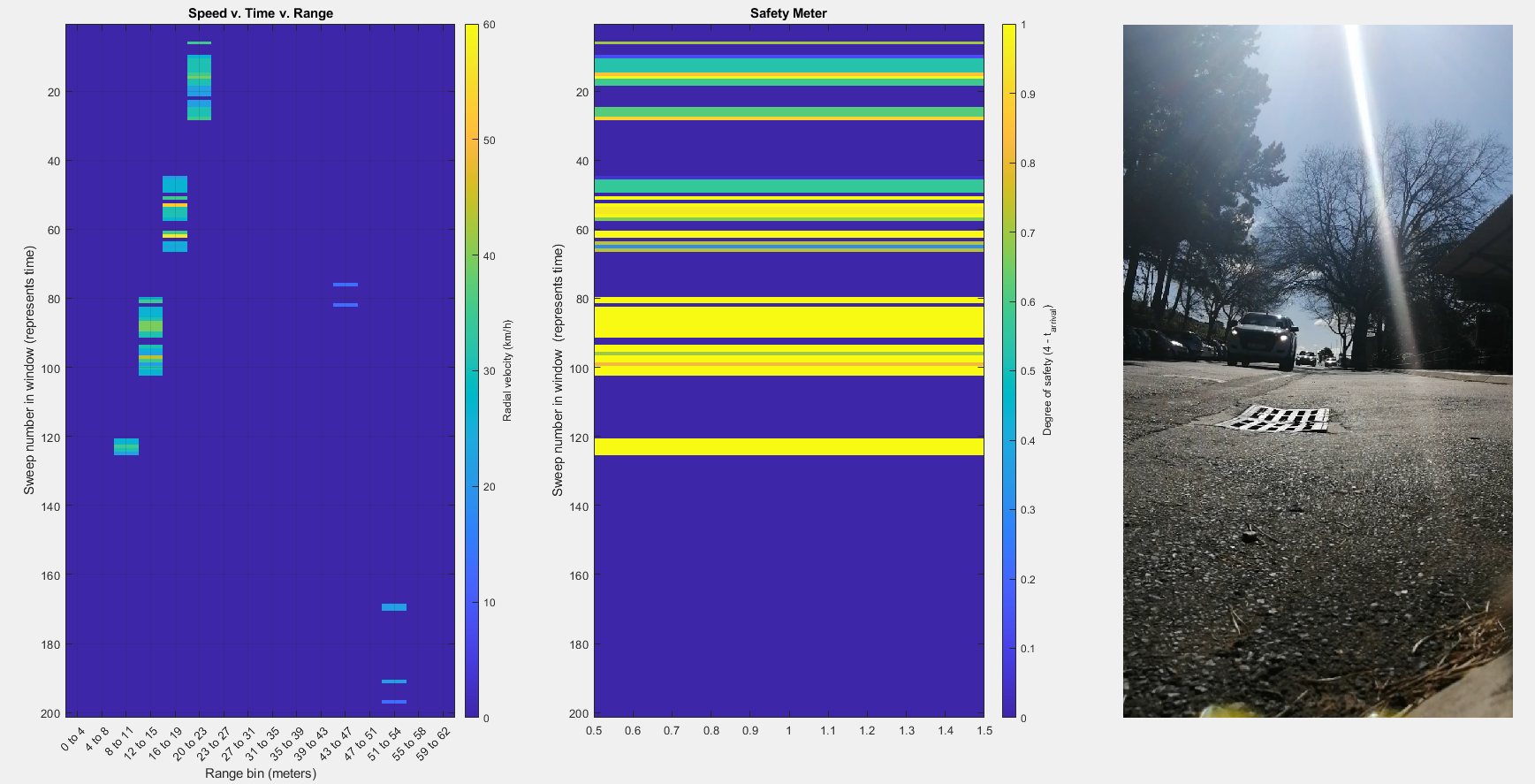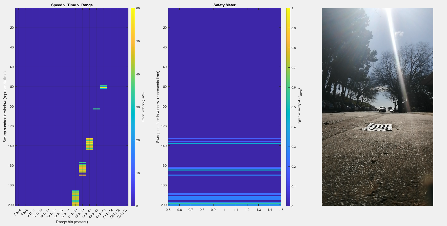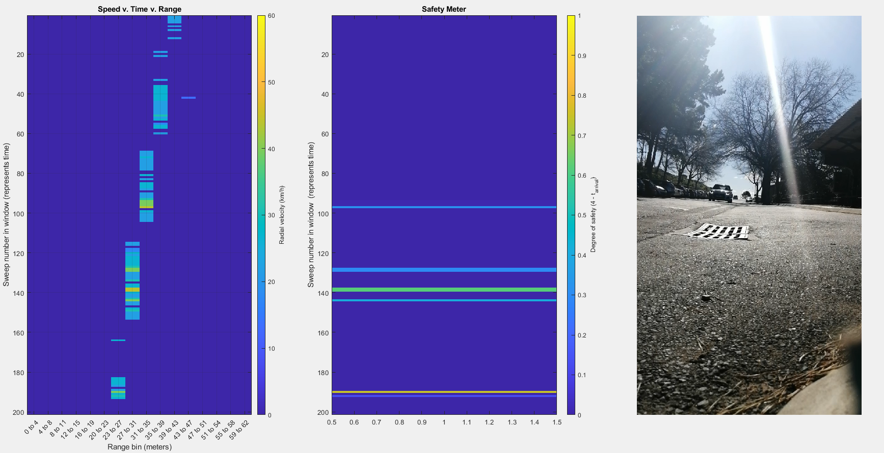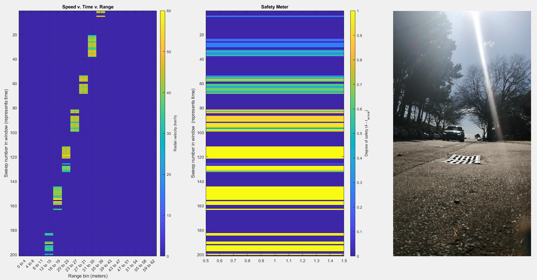 Taken on upper uct road, car traveling at a known speed/controlled experiment. Safety based on a min arrival time of 3 seconds, with a max speed of 60 km/h. Speeds tested: 20, 30, 40, 50, 60, 70 km/h. Video and radar output not perfectly synchronised (magic numbers used) due to unknown time required to render colour maps. Safety meter shows 4 sec - TOA. This allows shorter times (less safe) to be shown with a 'higher' colour.