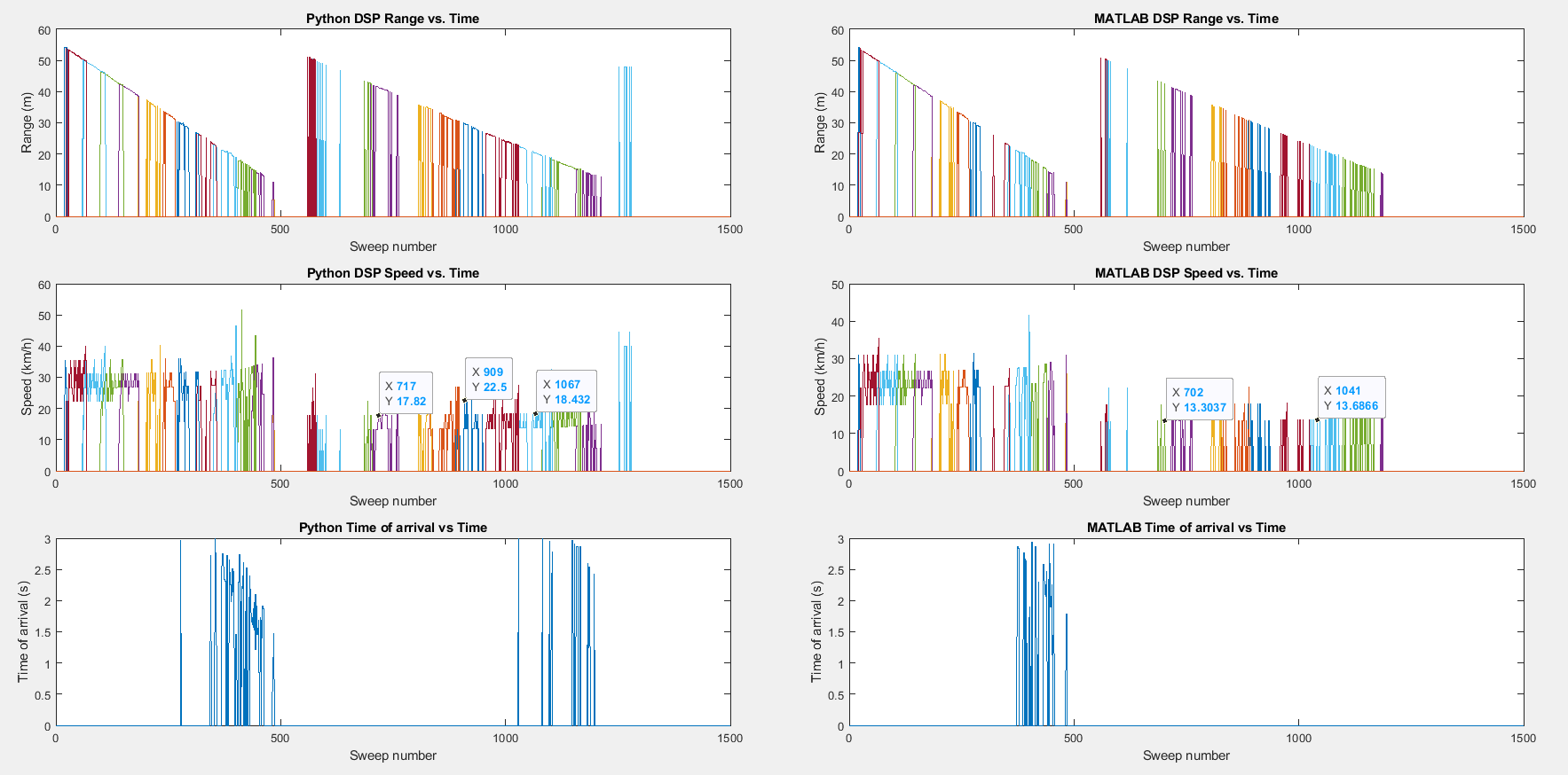 Note the late detection shown in the second plot below. Should have detected from the max range down. From a second measurement, it seems fast targets are harder to detect at further distances - could be due to weaker signals having shorter integration times.