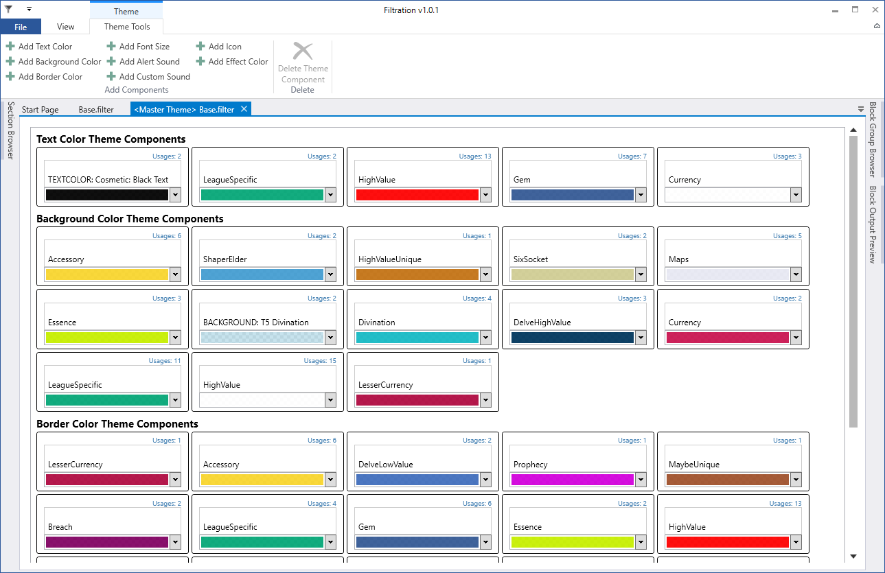- The Theme Editor allows you to create themes for scripts that support them, allowing you to easily change the colours of item filter scripts.