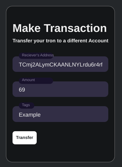 GetAccountBalance: Get the account balance of the user.ValidateAddress: Check whether the address is valid (i.e if it already exists on the blockchain).Last5Transactions: Get details of the last 5 transactions done by the user.GetUserDetails: Get the Tron address of the userCreateTransaction: Execute a transaction on the Tron Blockchainparams:ToAddress,Amount