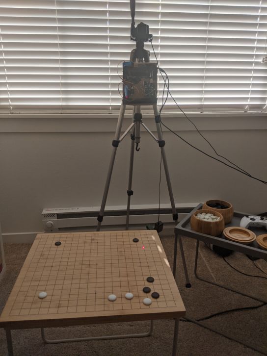 This project is a working proof of concept for a computer vision based robot that allows playing Go against a computer on a real board by using a laser to point to where the computer wishes to move on the board. The goal of this project was to get a working prototype up and running quickly so there is quite a bit of room for improvements and plenty of rough edges and shortcuts in the code. I highly encourage contrinutions and collaboration as it is my hope that the community can take this proof of concept and turn it into something that can be enjoyed by all. I can be reached at diegocepedaw@gmail.com for any questions.