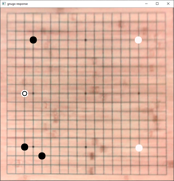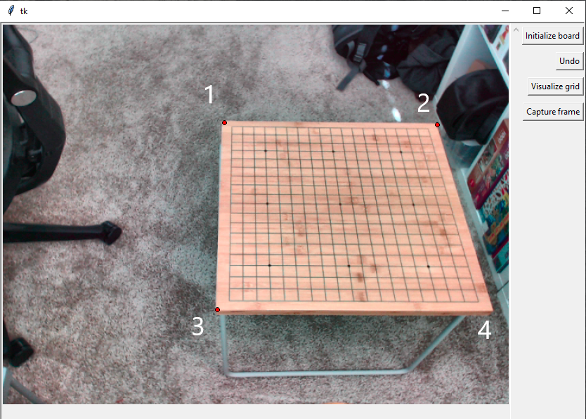 python3 .\boardProcess.pythis will open the program and take a picture with your webcam - click on the 4 corners of the go board starting with the top left of the image and going counter clockwise. the left mouse button will add a point and the right mouse button will remove a point