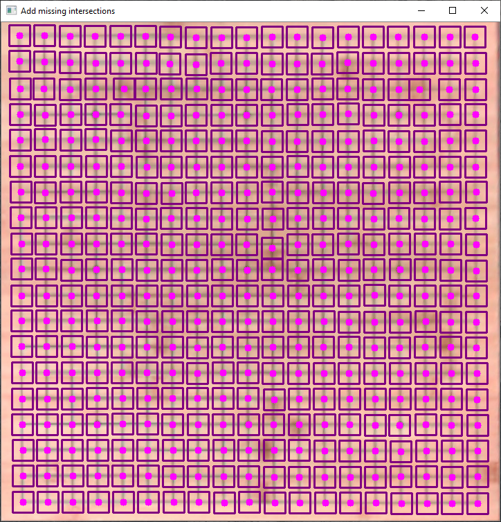 initialize board.This will bring up squares representing the automatically detected intersections you can manually correct them by using left mouseclick to add an intersection or right mouseclick to remove an intersection. To end the corrections pressESCand close the window with the detected intersections. - you can visualize the intersections on the original image by clicking on the