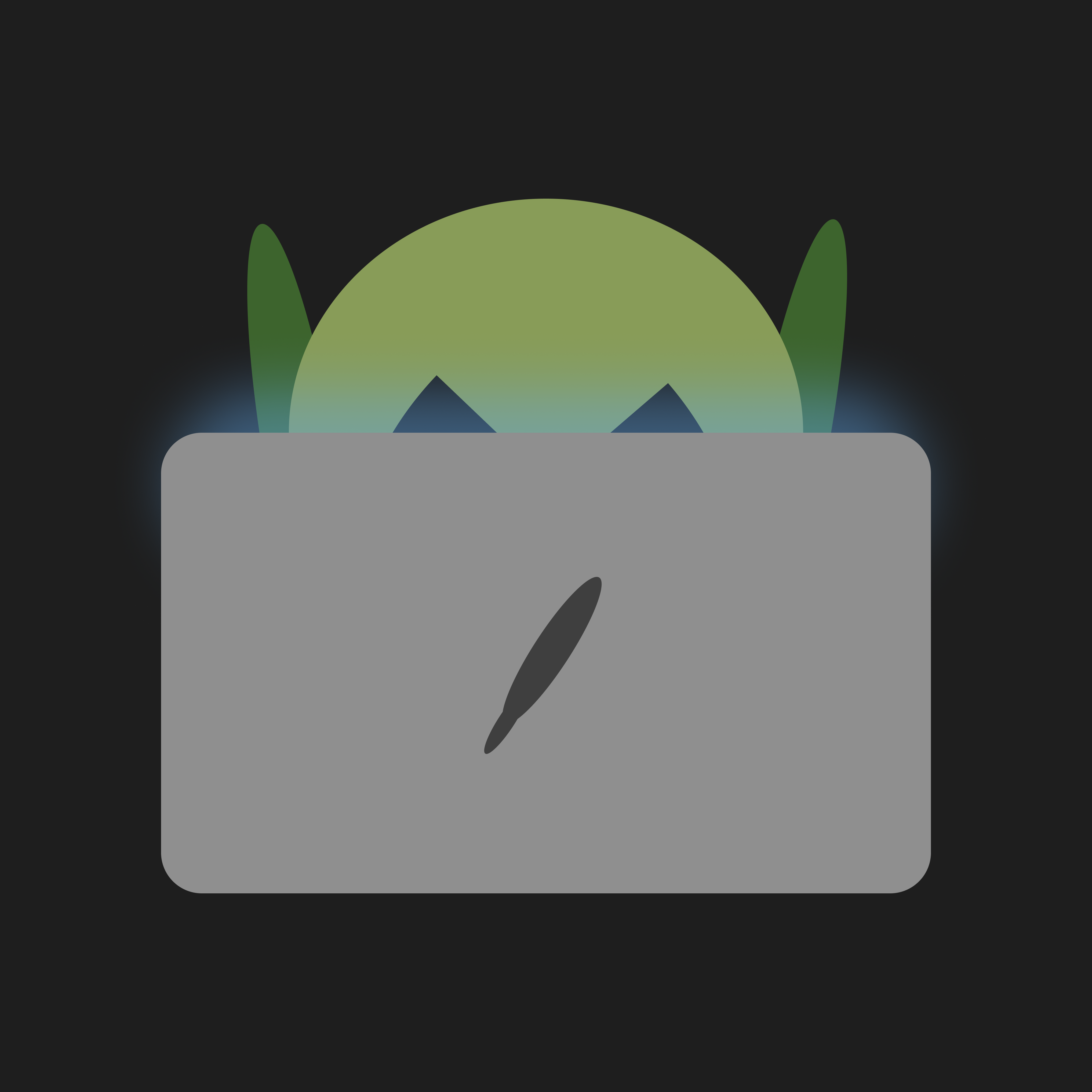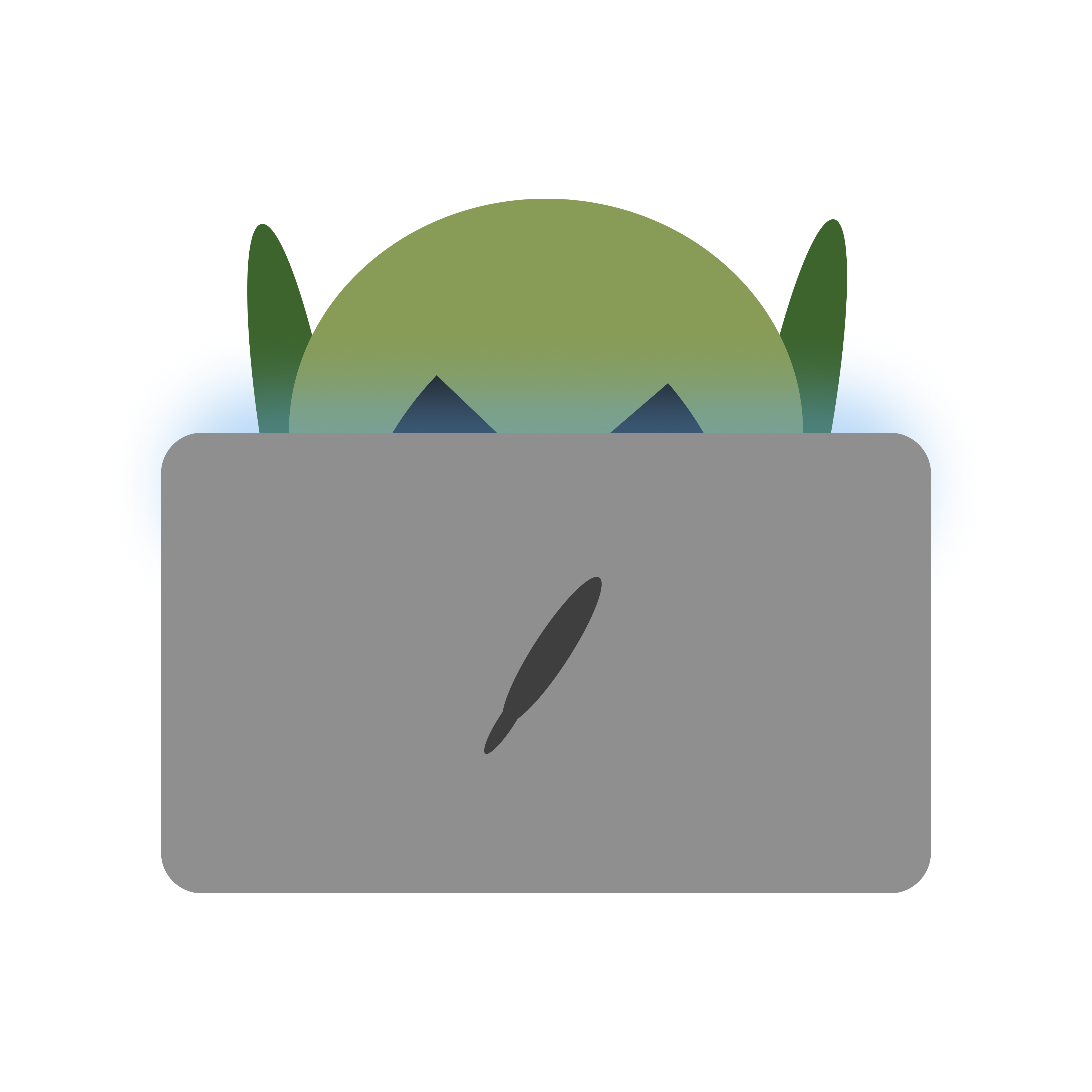 - Der Troll besteht aus einem hellgrünen (Avocado) Kreis mit zwei dunkleren (Fern) Ohren. Er blickt hinter dem Laptop hervor.