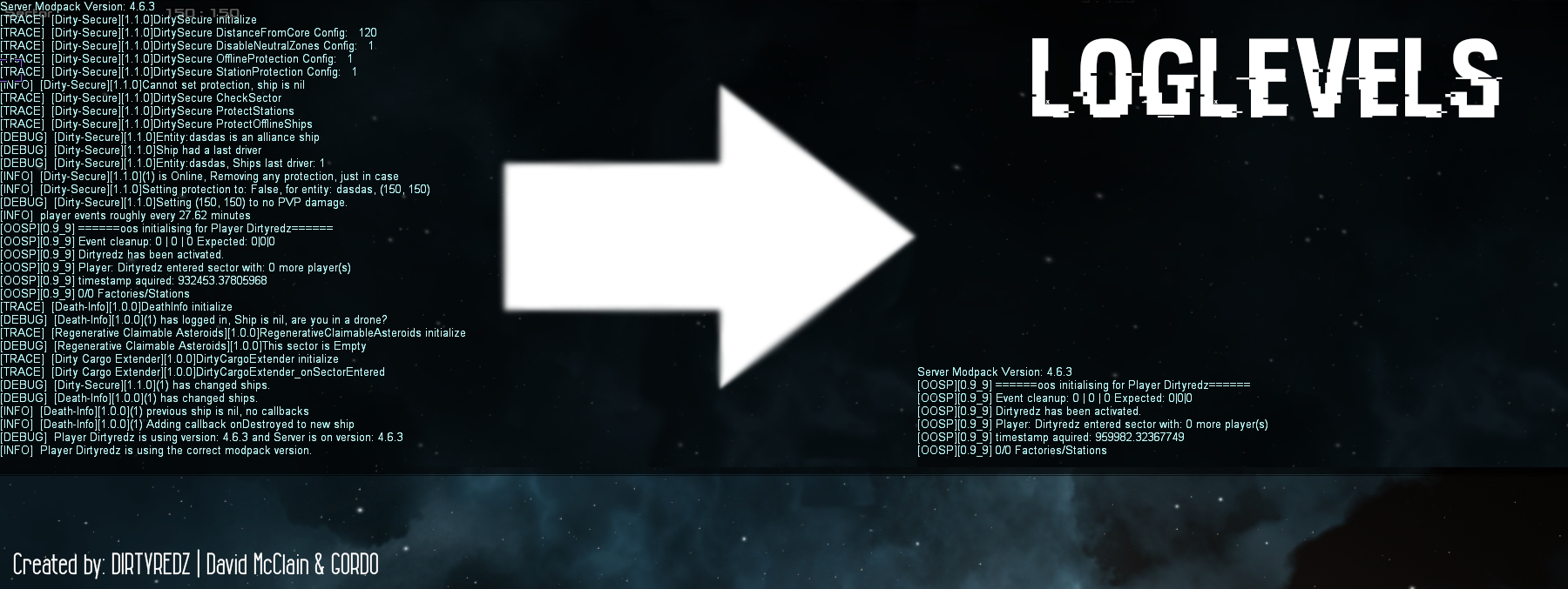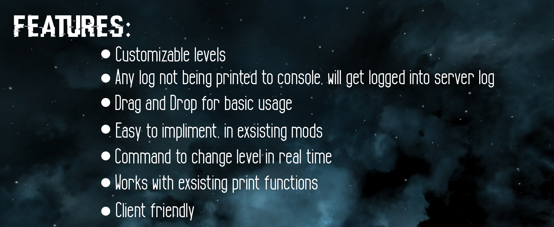 LogLevels gives modders the ability to set levels for there print functions Aswell as allowing server owners to clean up there consoles, making it easier to read.