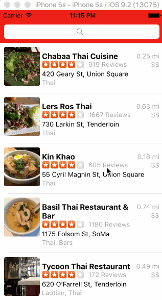 - Search bar should be in the navigation bar (doesn't have to expand to show location like the real Yelp app does).