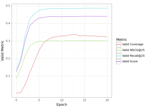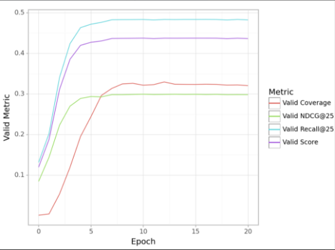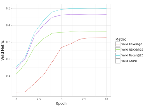 Model Score Recall@25 NDCG@25 baseline 0.2136 0.2181 0.2001 Opt1 0.2150 0.2198 0.2004 Opt2 0.2204 0.2251 0.2065 Opt3 0.2109 0.2157 0.1967 - FM 레이어를 함께 사용한 모델은 성능이 많이 떨어져서 Opt2모델을 최종 모델로 선정하였음