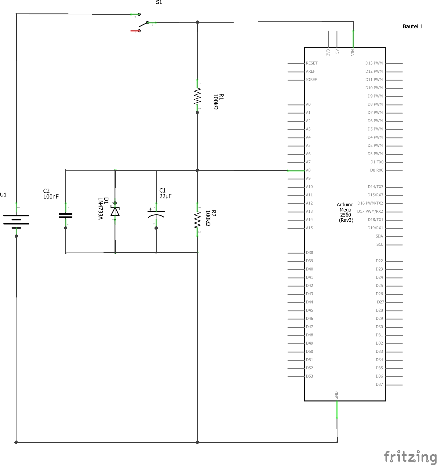 The Arduino analog digital converter has an input voltage range from 0 up to 5 Volts (by default). Since VBatMax = 8.4 V being far higher than 5 Volts, the measurement signal has to be converted by a voltage divider.