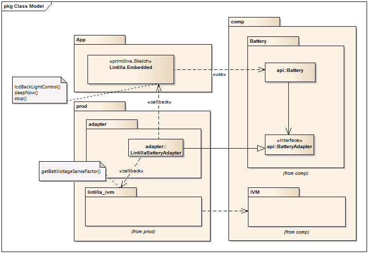 The Battery component on the other side sends out some notification callbacks through the adapter. The specific adapter method implementations by LintillaBatteryAdapter will then call the IVM or some global functions implemented by the sketch.