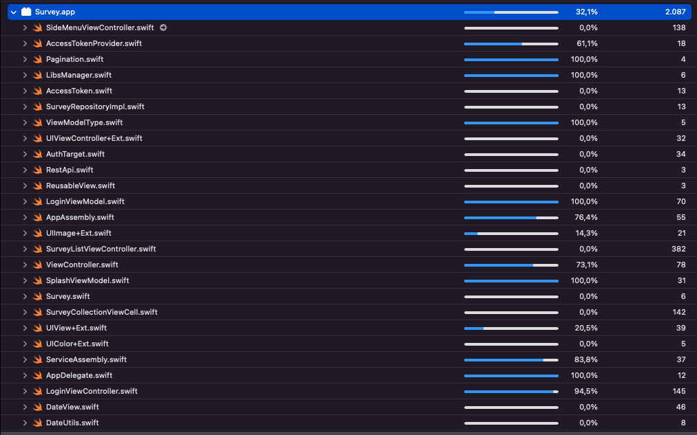 The test coverage for this project can be improved to reach above 60% for all the API-related classes used and create some UI tests for verifying a simple flow (e.g. open the Survey Lists screen from Login screen) in the application.