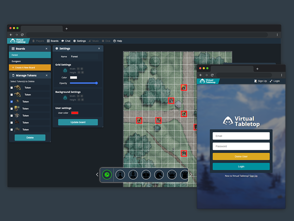 Virtual Tabletop is a sandbox to simulate grid-based tabletop environments. A live version of the application can be found here. This app is still a work-in-progress but has working CRUD operations along with the use of websockets and image upload to AWS. This project was created by Dias Iskrayev, Dillon Rice, Steven Touba, and Wayne Su.