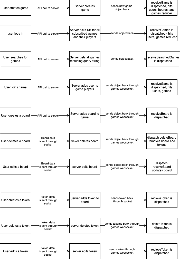 This applications makes use of websockets to recieve and transmit changes to the game state. When there is an update to the board, for example, the user makes the changes through the ui. When they click "update board", our game client creates an updated board object and transmits it back through the websocked that was set up for the game room. The changes are routed to the boards controller where they are posted to the database and then returned back through the websocket to all of the users who are currently subscribed to the game room's socket.