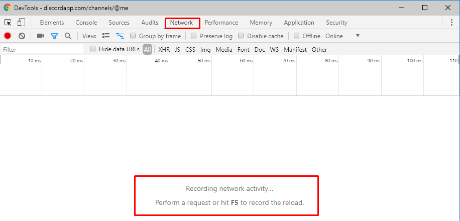 First, open the Discord console by pressing CTRL + SHIFT + I (COMMAND + SHIFT + I on Mac). Then, navigate to the "Network" tab and press F5 to reload your page/client: