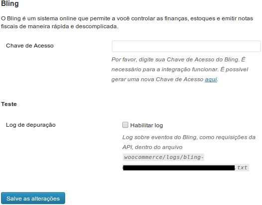 - Preencha a opção Chave de Acesso e ative o Bling.