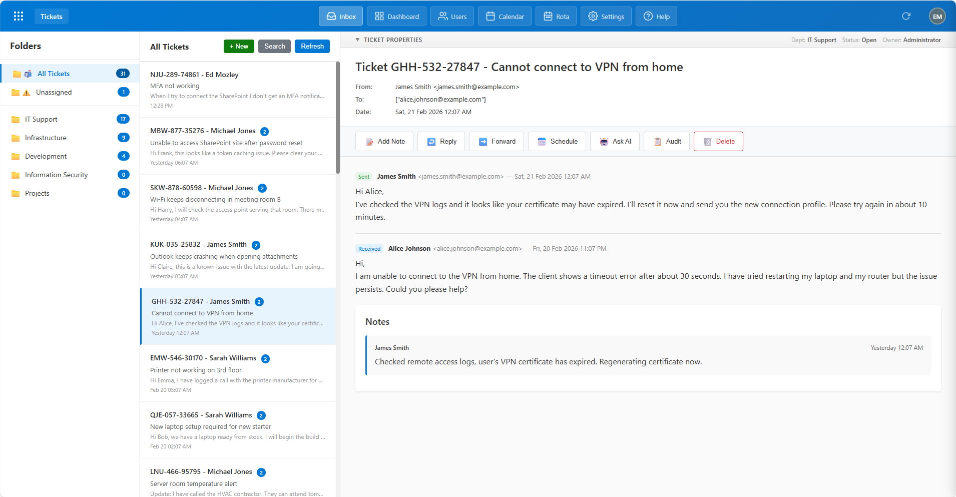 - Includes tickets, assets, knowledge articles, changes, calendar events, morning checks, contracts, service status, software licences, and forms