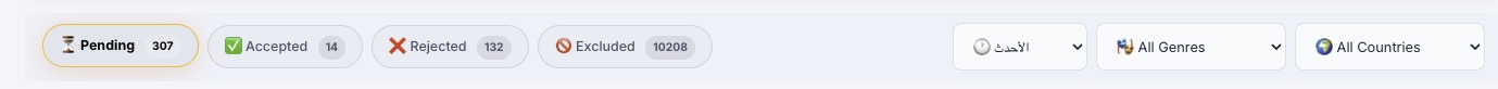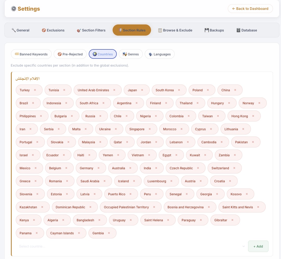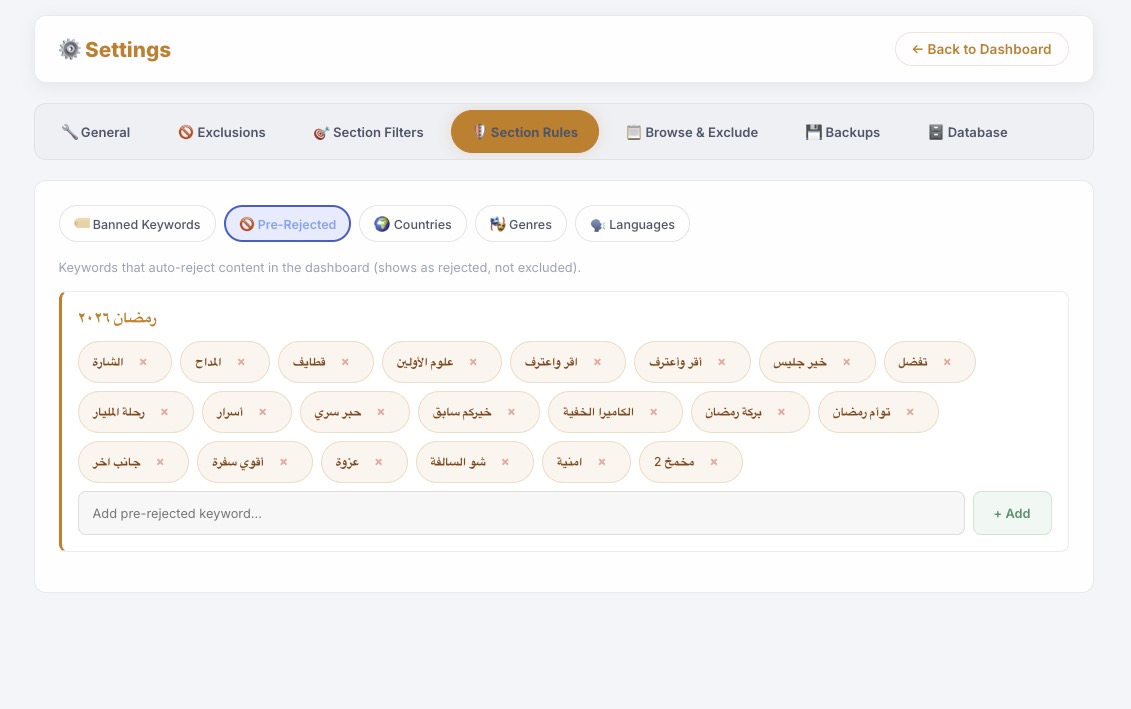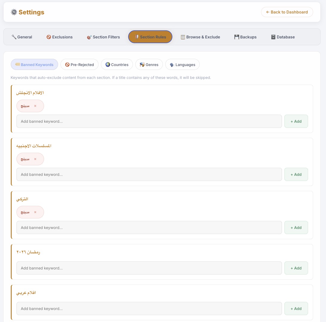 | Section Rules | Banned keywords, pre-rejected keywords, section countries, genres, and languages | كلمات محظورة، كلمات مرفوضة مسبقًا، وقواعد بلاد/أنواع/لغات لكل قسم |