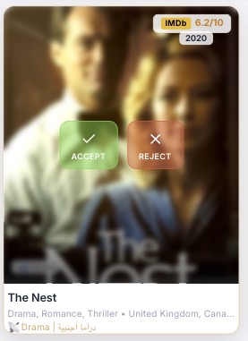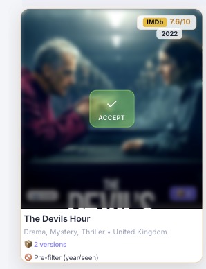 Hovering a card reveals direct decision actions. Accept starts the ownership path toward download and playback; Reject removes noise without deleting history.