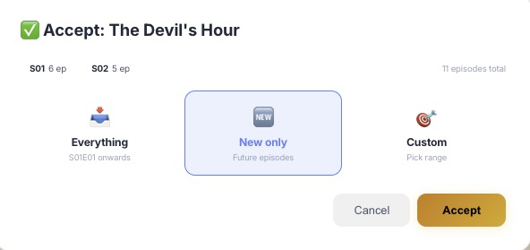 Series acceptance can download the full show, only new episodes, or a custom start season and episode. This prevents wasting bandwidth on episodes already watched elsewhere.