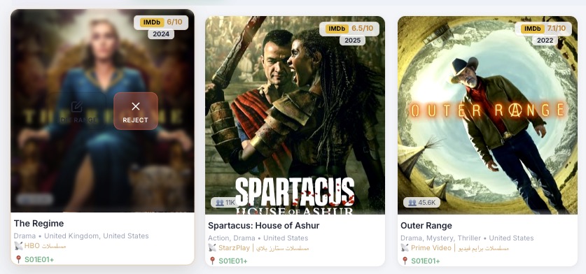 - Cards combine IPTV source data with TMDB, OMDb, IMDb, local disk state, and decision state.