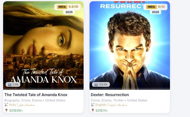 الشاشة الأولى هي لوحة العمل الحقيقية: أقسام، كروت، بوسترات، تقييمات، سنة، بلد، نوع، مصدر، وأعداد مباشرة تساعدك تختار بسرعة.
