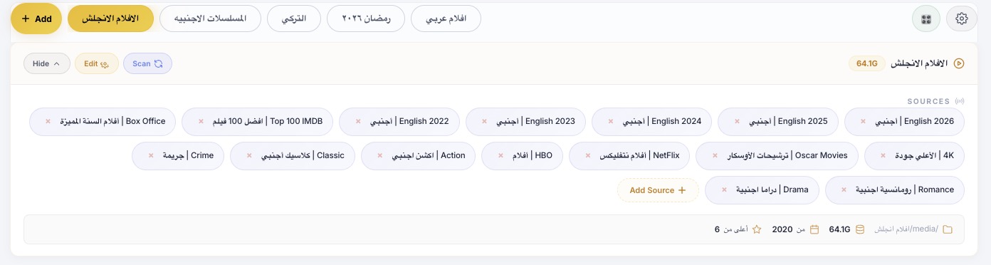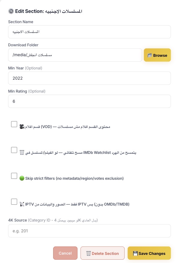 نافذة إضافة قسم تنشئ مسار محتوى كامل: اسم، مصادر، فولدر، وضع أفلام/مسلسلات، فلاتر، وقواعد متقدمة.