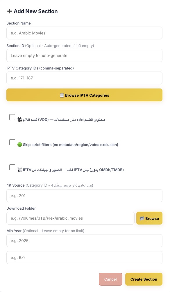 The Add Section modal creates a complete content lane: name, source categories, folder, movie/series mode, filter thresholds, strictness, IPTV-only mode, watched-delete behavior, and quality flags.
