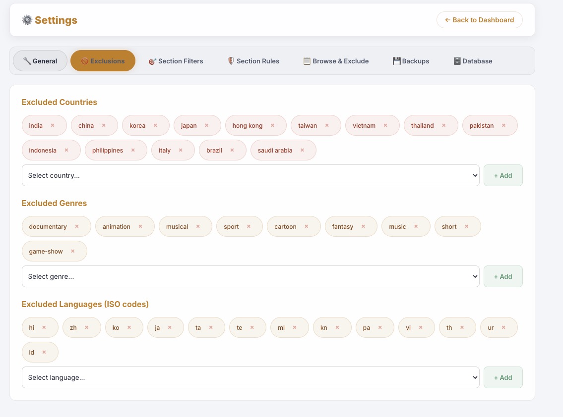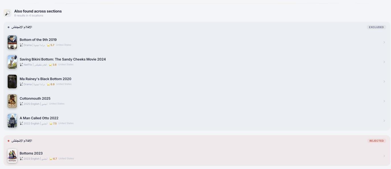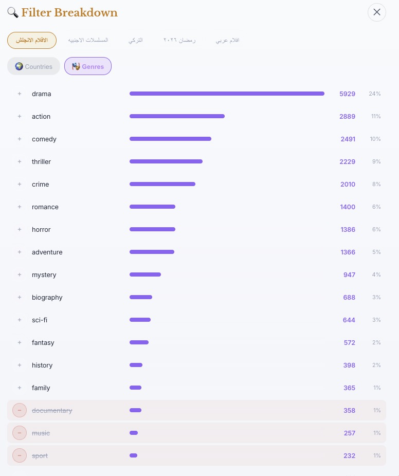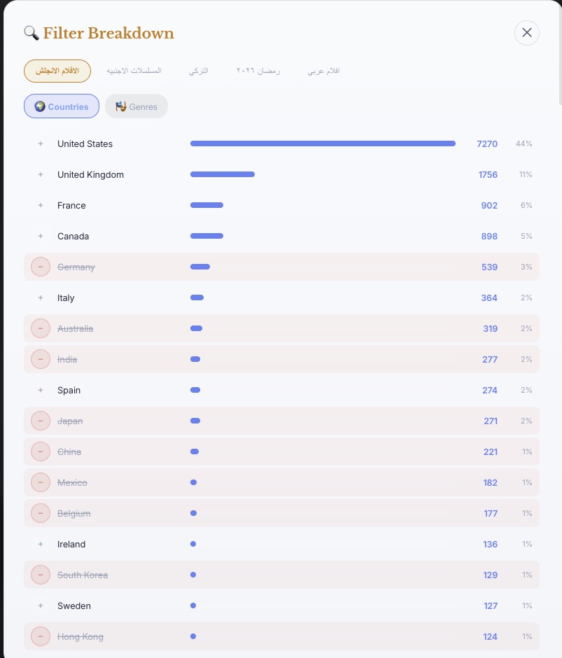 | Global Exclusions | Countries, genres, and languages applied across all sections | استبعاد عام للبلاد والأنواع واللغات |