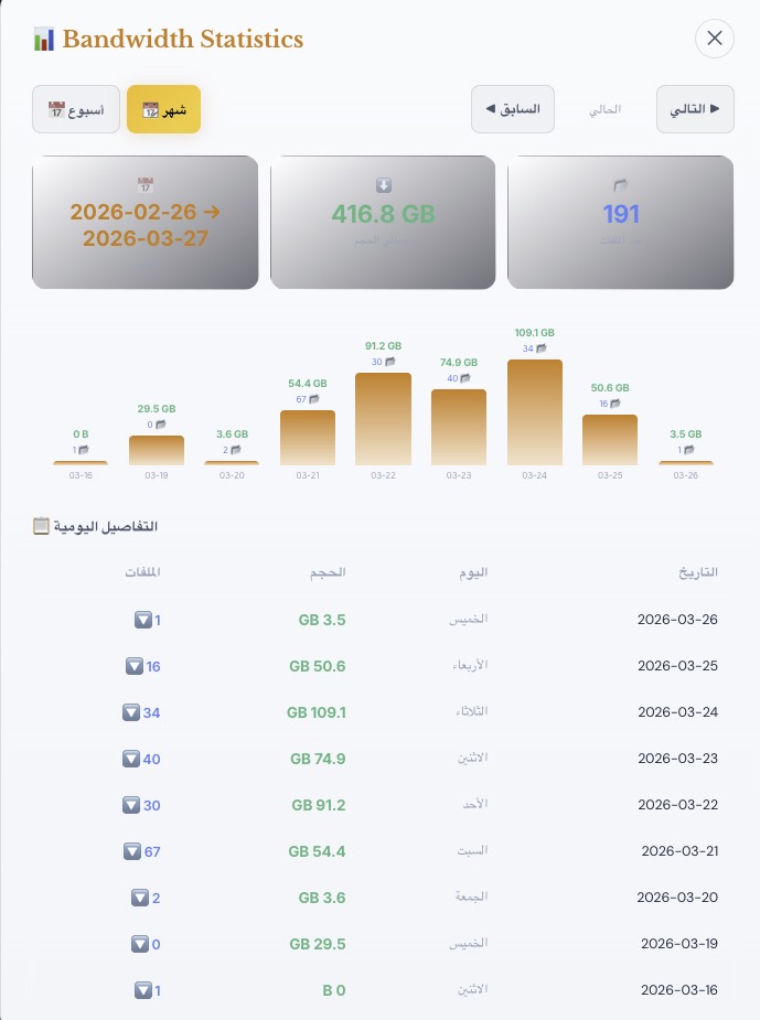 | General - Download Limits | Daily files, daily GB, monthly files, monthly GB, and live usage status | حدود يومية وشهرية بعدد الملفات والحجم مع حالة الاستخدام |