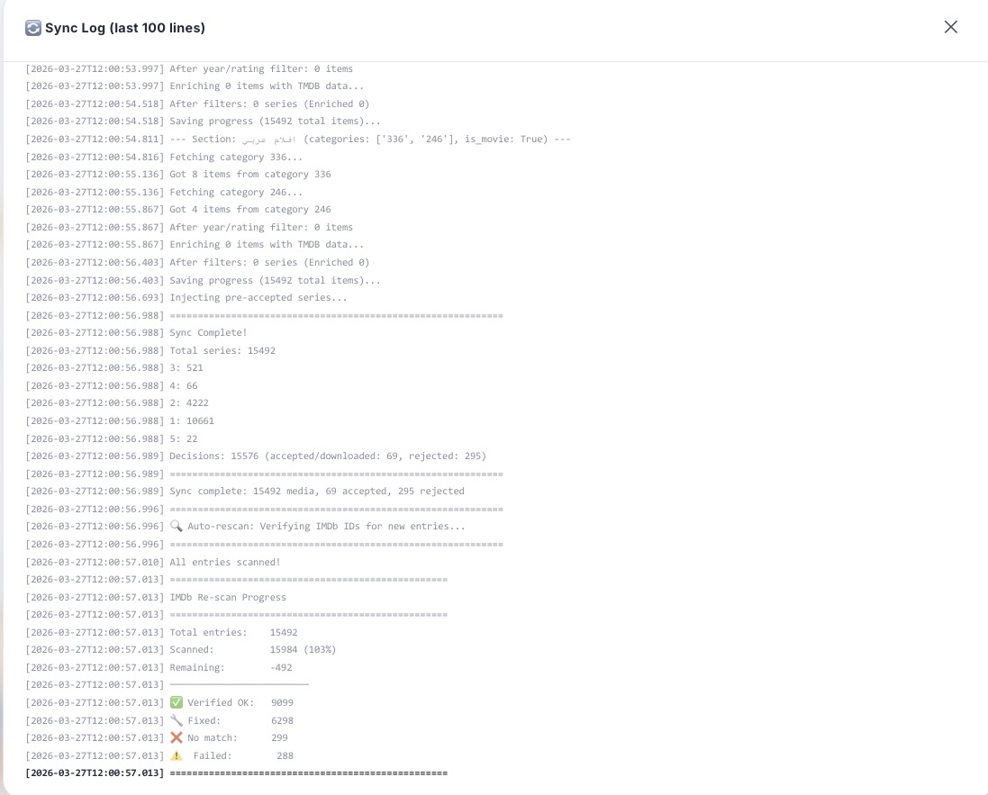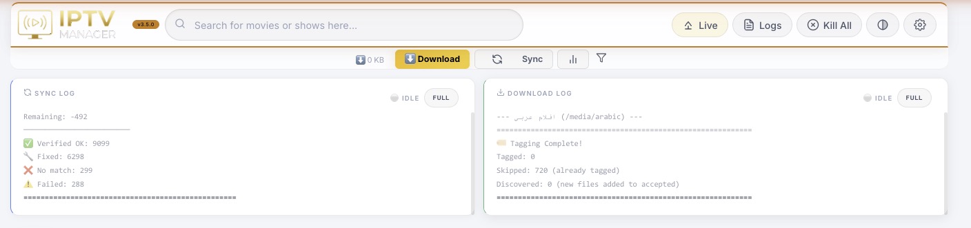 IPTV Manager turns a large, noisy IPTV subscription catalog into a controlled media library workflow. It is not only a downloader. It is a full decision system: it imports provider catalogs, enriches titles with metadata, applies global and per-section rules, shows every item in a review dashboard, downloads accepted content with aria2c, supports local/browser playback, tracks Plex watch state, discovers files already on disk, detects broken downloads, keeps a trash/restore path, monitors connected clients, and publishes update packages.
