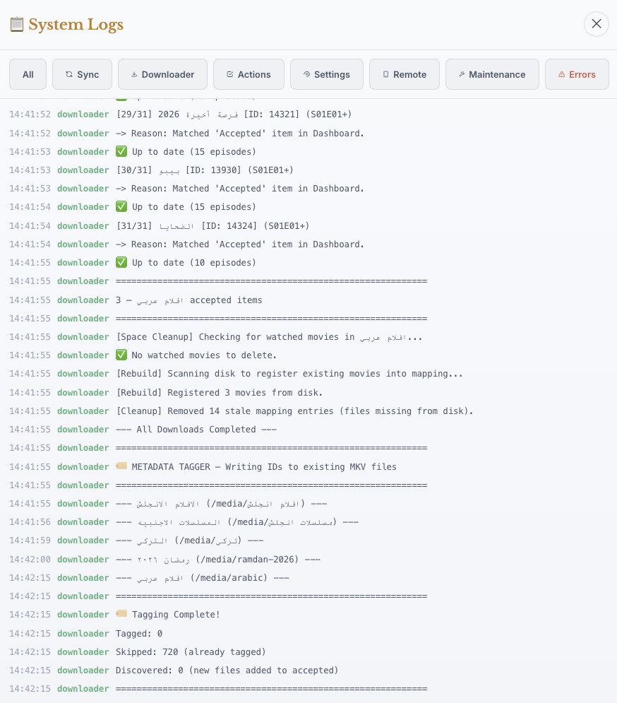 | Maintenance | Sync interval, manual Sync, Start Download, Stop Download, Kill All, auto-maintenance status | جدول المزامنة، تشغيل يدوي، بدء/إيقاف التحميل، Kill All، وحالة الصيانة التلقائية |