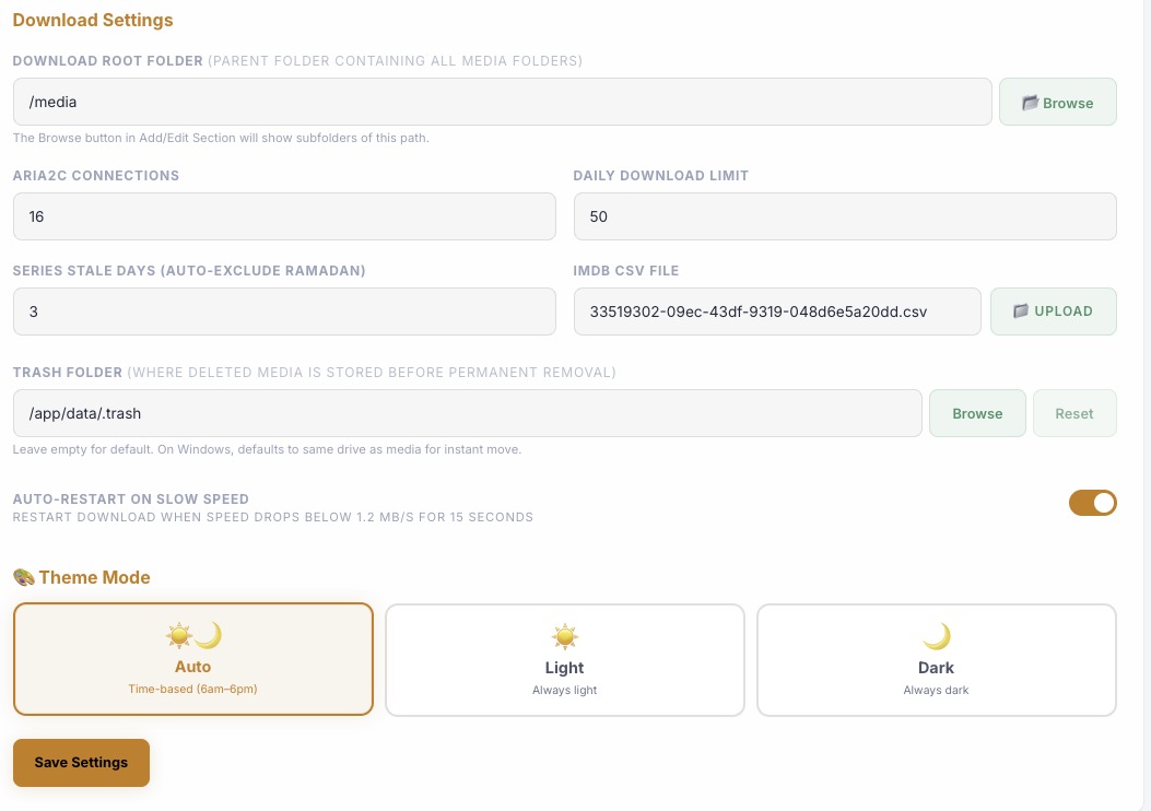 | General - Download Settings | Media root, folder browser, aria2c connections, IMDb CSV import, trash folder, smart restart toggle, speed threshold, automatic download interval | فولدر الميديا، متصفح الفولدرات، اتصالات aria2c، CSV، المهملات، إعادة التشغيل الذكية، والجدول |