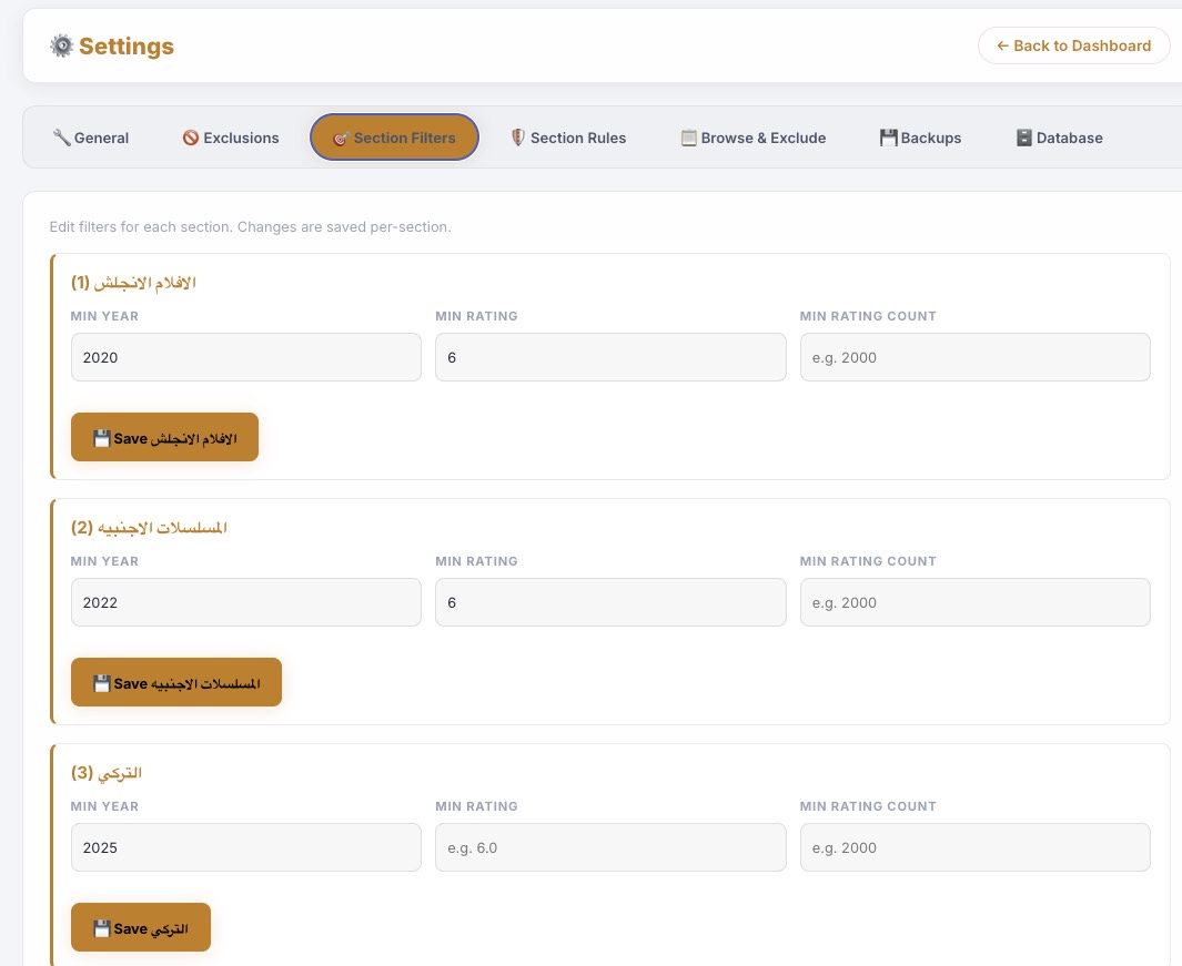 | Section Filters | Min year, min rating, min votes per section | حدود مستقلة لكل قسم للسنة والتقييم وعدد الأصوات |